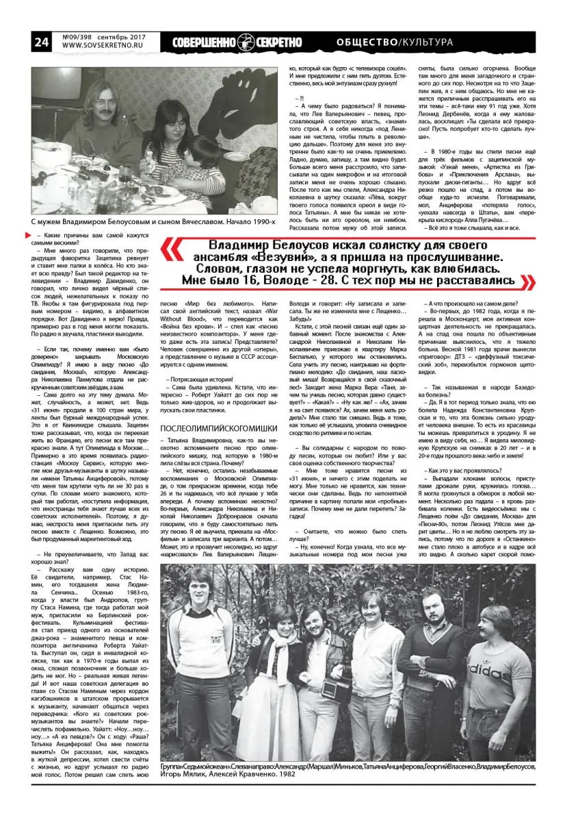 – Сама долго на эту тему думала. Может, случайность, а может, нет. Ведь «31 июня» продали в 100 стран мира, у ленты был бурный международный успех. Это я от Квинихидзе слышала. Зацепин тоже рассказывал, что, когда он переехал жить во Францию, его песни все там прекрасно знали. А тут Олимпиада в Москве… Примерно в это время появилась радиостанция «Москоу Сервис», которую многие мои друзья-музыканты в шутку называли «имени Татьяны Анциферовой», потому что меня там крутили чуть ли не 30 раз в сутки. По словам моего знакомого, который там работал, «поступила информация, что иностранцы тебя знают лучше всех из советских исполнителей». Поэтому, я думаю, неспроста меня пригласили петь эту песню вместе с Лещенко. Возможно, это был продуманный маркетинговый ход.