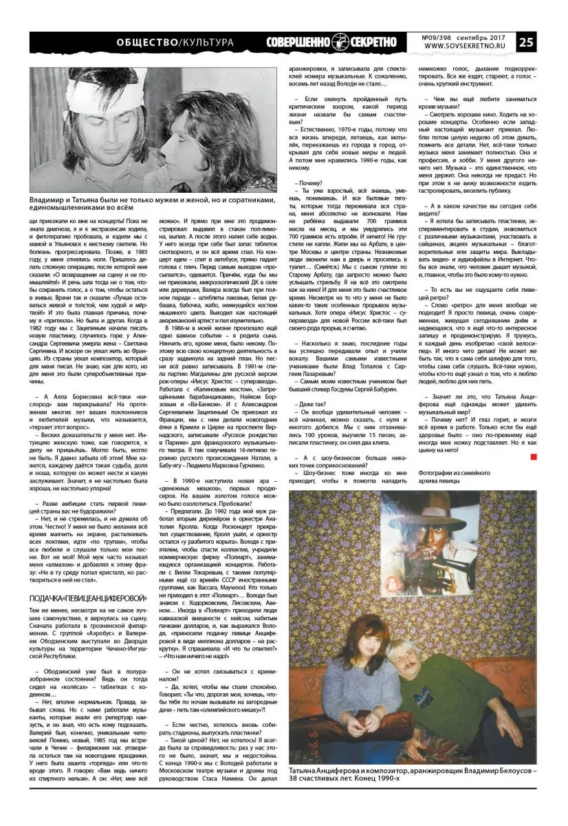 …Сегодня певица от шоу-бизнеса старается держаться подальше: на гастроли не ездит, в концертах участвует крайне редко. Отгородилась от посторонних высоченным «забором» и в свой дом-крепость лишних людей не пускает. Занимается вокалом с вундеркиндами – будущими звёздами. Пристально следит за всеми новинками и тенденциями мировой музыки. То есть по-прежнему полностью «в теме» – живёт музыкой. И поёт. Придя домой, я несколько раз подряд прослушал новый компакт-диск, который Татьяна Анциферова подарила мне на память об этом откровенном интервью. Всё-таки как же божественно она поёт!