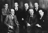 Группа психоаналитиков. Зигмунд Фрейд (сидит слева) и Макс Эйтингон (стоит второй справа), 1920 г. |