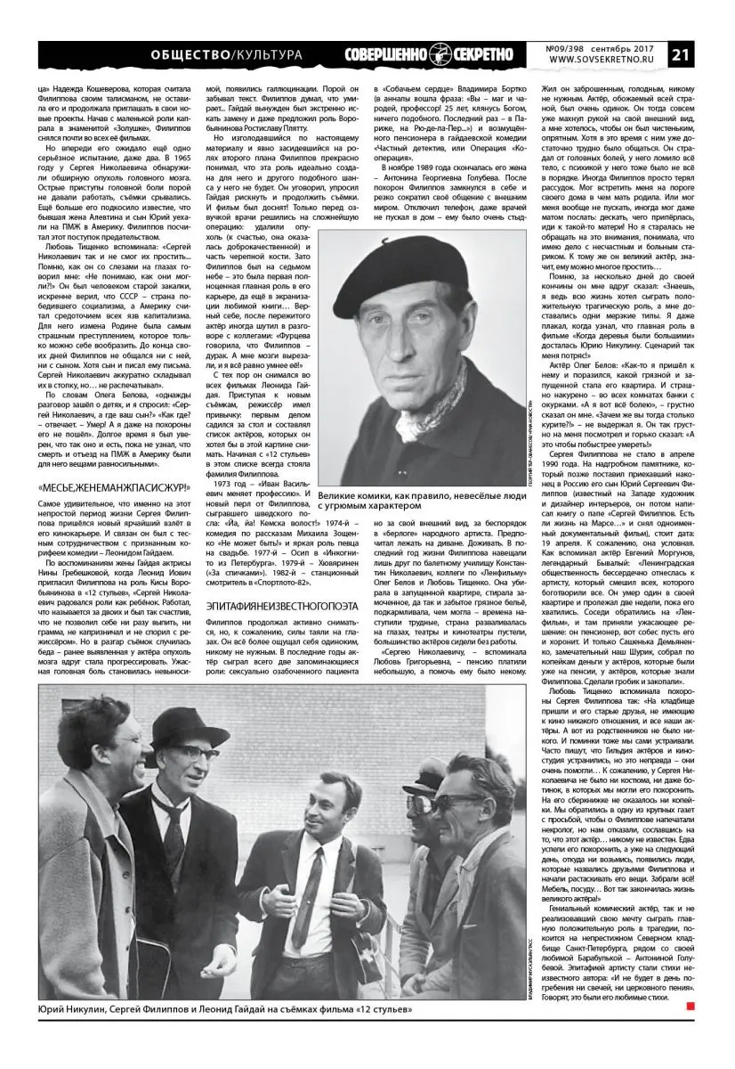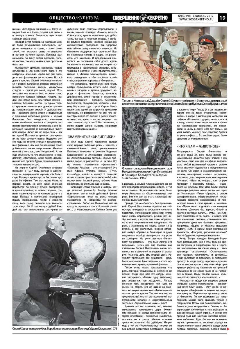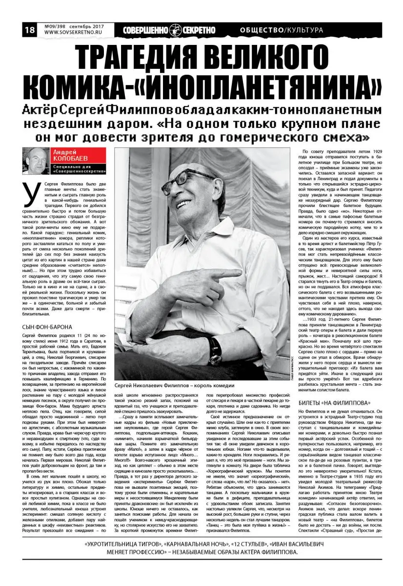 У Сергея Филиппова было две главные мечты: стать знаменитым и сыграть главную роль в какой-нибудь гениальной трагедии. Первого он добился сравнительно быстро и потом большую часть жизни страшно страдал от безграничного зрительского обожания. А вот такой роли-мечты кино ему не подарило. Какой парадокс: гениальный комик, «инопланетянин» юмора, реплики которого заставляли кататься по полу и умирать от смеха несколько поколений зрителей (до сих пор без знания наизусть цитат из его картин в нашей стране даже среднее образование «считается» неполным!)… Но при этом трудно избавиться от ощущения, что эту самую свою гениальную роль в драме он всё-таки сыграл. Только не в кино и не на сцене, а в своей реальной жизни. Поскольку жизнь он прожил поистине трагическую и умер так же – в одиночестве, больной и забытый почти всеми. Даже дата смерти – приблизительная.