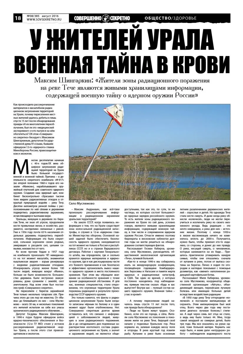 Как происходило рассекречивание материалов о масштабном радиационном загрязнении территорий на Урале, почему переселения местных жителей удалось добиться лишь спустя 15 лет после обнародования правды об их многолетнем переоблучении, был ли это «медицинский эксперимент» и кто пытался на нём обогатиться? Об этом «Совершенно секретно» беседует с Максимом Шингаркиным, депутатом Государственной думы VI созыва, бывшим офицером 12-го «ядерного» главка Минобороны России, правозащитником и экологом.