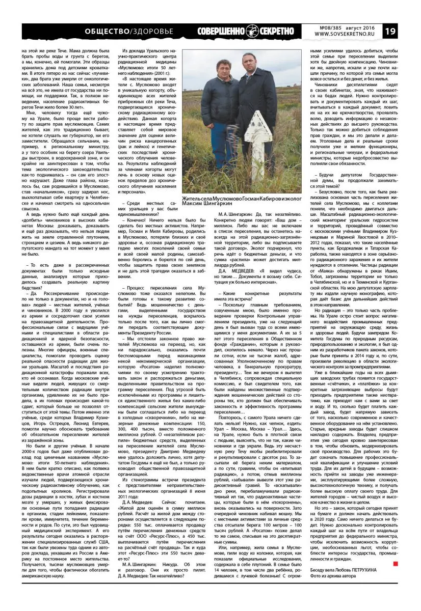 – Безусловно, после того, как была реализована основная часть переселения жителей села Муслюмово, мы с коллегами поняли, что необходимо двигаться дальше. Масштабный радиационно-экологический мониторинг уральских гидросистем и территорий, проведённый совместно с московскими учёными Владимиром Кузнецовым и Мариной Хвостовой в 2010–2012 годах, показал, что такие населённые пункты, как Бродокалмак и Татарская Караболка, также находятся в зоне серьёзного радиационного заражения и их жители нуждаются в отселении. Частицы радиации от «Маяка» обнаружены в реках Ишим, Тобол, загрязнены территории не только в Челябинской, но и в Тюменской и Курганской областях. На мою депутатскую зарплату мы издали научную монографию, которая даёт базис для дальнейших действий в этом направлении.