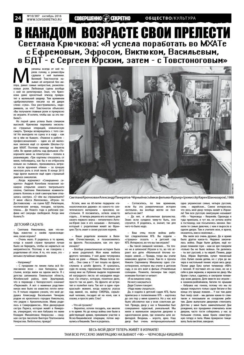 …Когда журналист «Совершенно секретно» Андрей Колобаев позвонил накануне открытия нового театрального сезона, Светлана Николаевна комментировать болезнь и своё самочувствие отказалась наотрез. «О чём вы спрашиваете? У меня «Васса Железнова», «Игрок» по Достоевскому – на сцене БДТ. Репетиции, поэтические вечера, поездки, гастроли, планы… До Нового года в рабочем графике нет секунды свободной. Когда мне болеть?!»