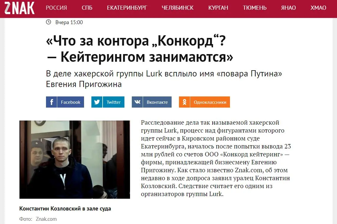 «Совершенно секретно»: Издание Znak.com опубликовало «расследование» о хакерской группировке Lurk, которая якобы украла 23 миллиона рублей со счетов компании «Конкорд Кейтеринг» бизнесмена Евгения Пригожина в 2016 году. Вся работа журналистов рассыпается о два простых факта: пресс-служба компании отрицает факт кражи, а сам «Конкорд Кейтеринг» появился только в 2018 году.