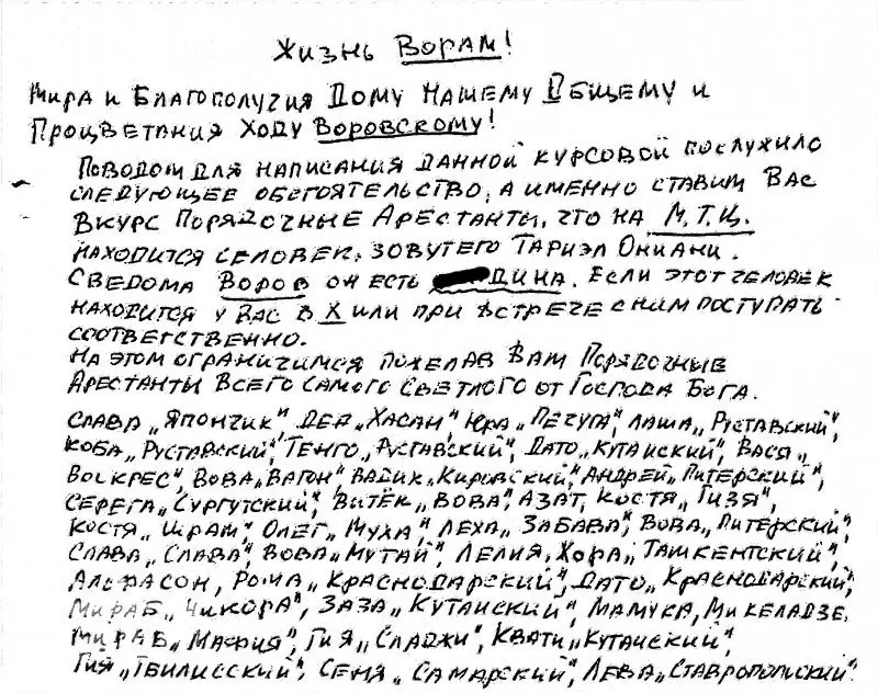 «Жизнь Ворам! Мира и Благополучия Дому Нашему Общему и Процветания Ходу Воровскому! Поводом для написания данной курсовой послужило следующее обстоятельство, а именно ставим вас в курс, Порядочные Арестанты, что на М.Т.Ц. (Матросская Тишина Централ. – Ред.) находится человек, зовут его Тариэл Ониани. С ведома Воров он есть бл(*)дина. Если этот человек находится у вас в Х (хате. – Ред.) или при встрече с ним поступайте соответственно. На этом ограничимся, пожелав Вам, Порядочные Арестанты, Всего Самого Светлого от Господа Бога».