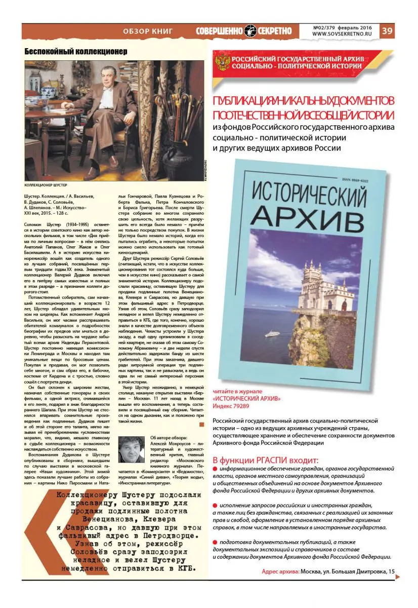 Соломон Шустер (1934–1995) останется в истории советского кино как автор нескольких фильмов, в том числе «Дня приёма по личным вопросам» – в нём снялись Анатолий Папанов, Олег Жаков и Олег Басилашвили. А в историю искусства кинорежиссёр вошёл как создатель одного из лучших собраний, посвящённых первым тридцати годам XX века. Знаменитый коллекционер Валерий Дудаков включил его в пятёрку самых известных и полных в этом разряде – а признание коллеги дорогого стоит.