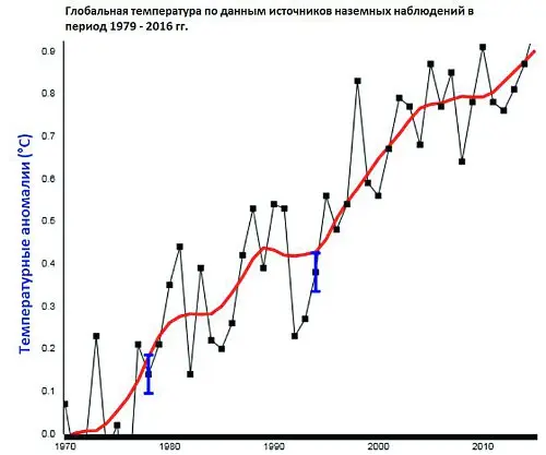 Рис. 2. Как менялась глобальная температура по данным наземных источников наблюдения в период с 1979 по 2016