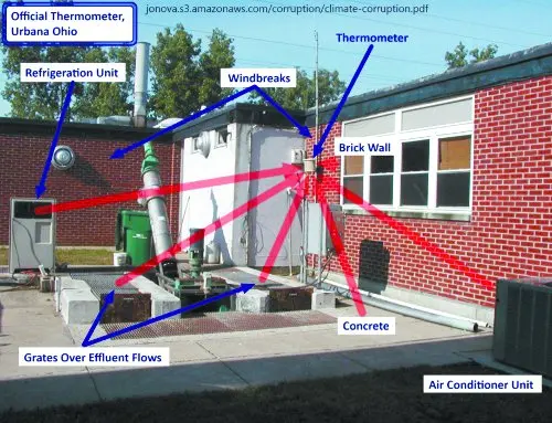 Посмотрим, например, как расположен термометр в г. Урбане (Огайо, США), входящий в официальную сеть национальных источников информации об изменении климата (см. рис. 1). Оказывается, он прикреплён к стене, рядом с такими источниками тепловых выбросов, как рефрижератор, кондиционер, форточки, бетонные панели… Всё это ещё более усугубляет уже имеющийся эффект городского «теплового пятна» и делает искажение данных просто неизбежным. Заметим, что вообще-то так располагать термометры, по американским правилам, нельзя: подобные измерительные приборы следует размещать не ближе чем в 100 футах (30 метрах) от любой мостовой или бетонной поверхности, на открытом пространстве, с поверхностью почвы, характерной для данного региона