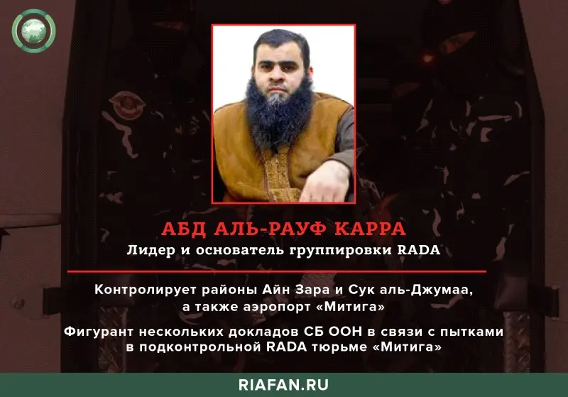 Главарь группировки RADA Абд аль-Рауфа Карра, боевики которого контролируют тюрьму «Митига», где содержатся россияне, входит в состав МВД ПНС. Его бандформирование прославилось пытками, убийствами, похищениями и грабежами.