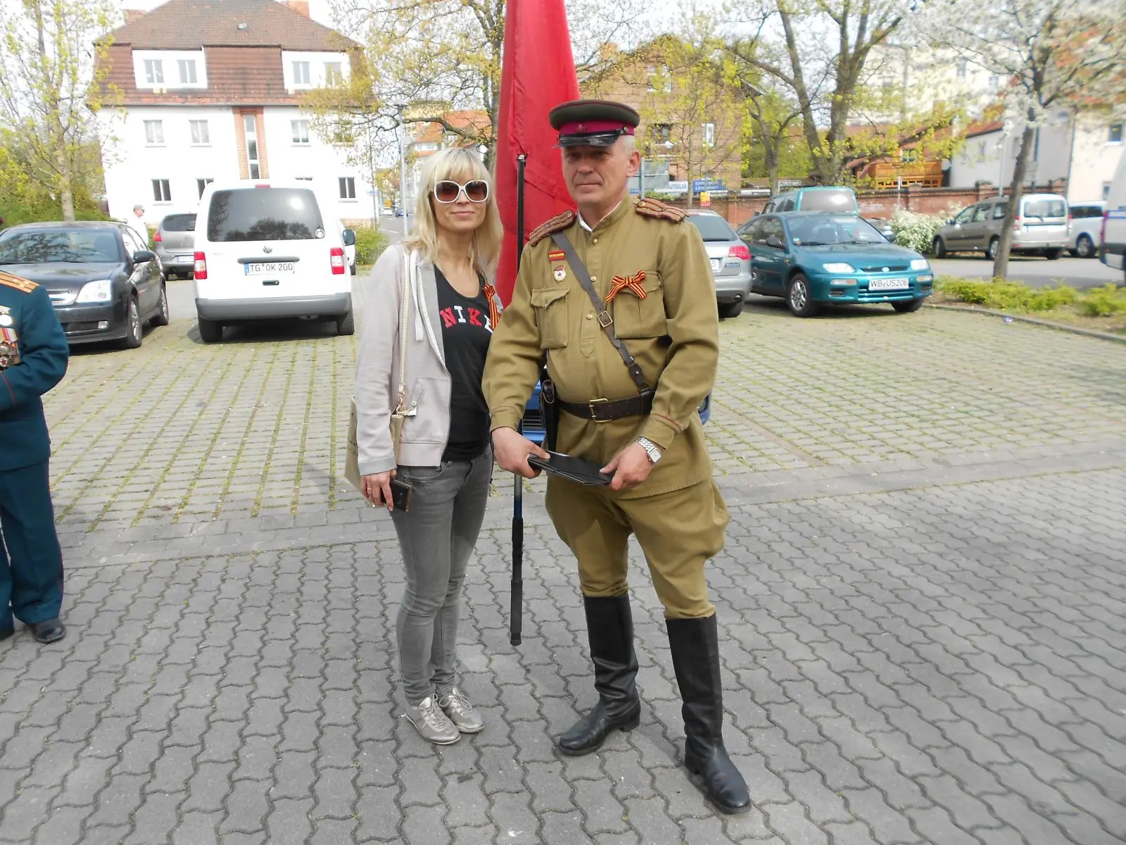 Выдвигаемся в город. Вокруг царит праздничная атмосфера. В преддверии торжеств немецкие школьники украсили мост через реку бумажными голубями, на которых написаны призывы к миру. Прохожие приветствуют людей в форме. Просят сфотографироваться. С удовольствием прикрепляют на грудь георгиевские ленты.