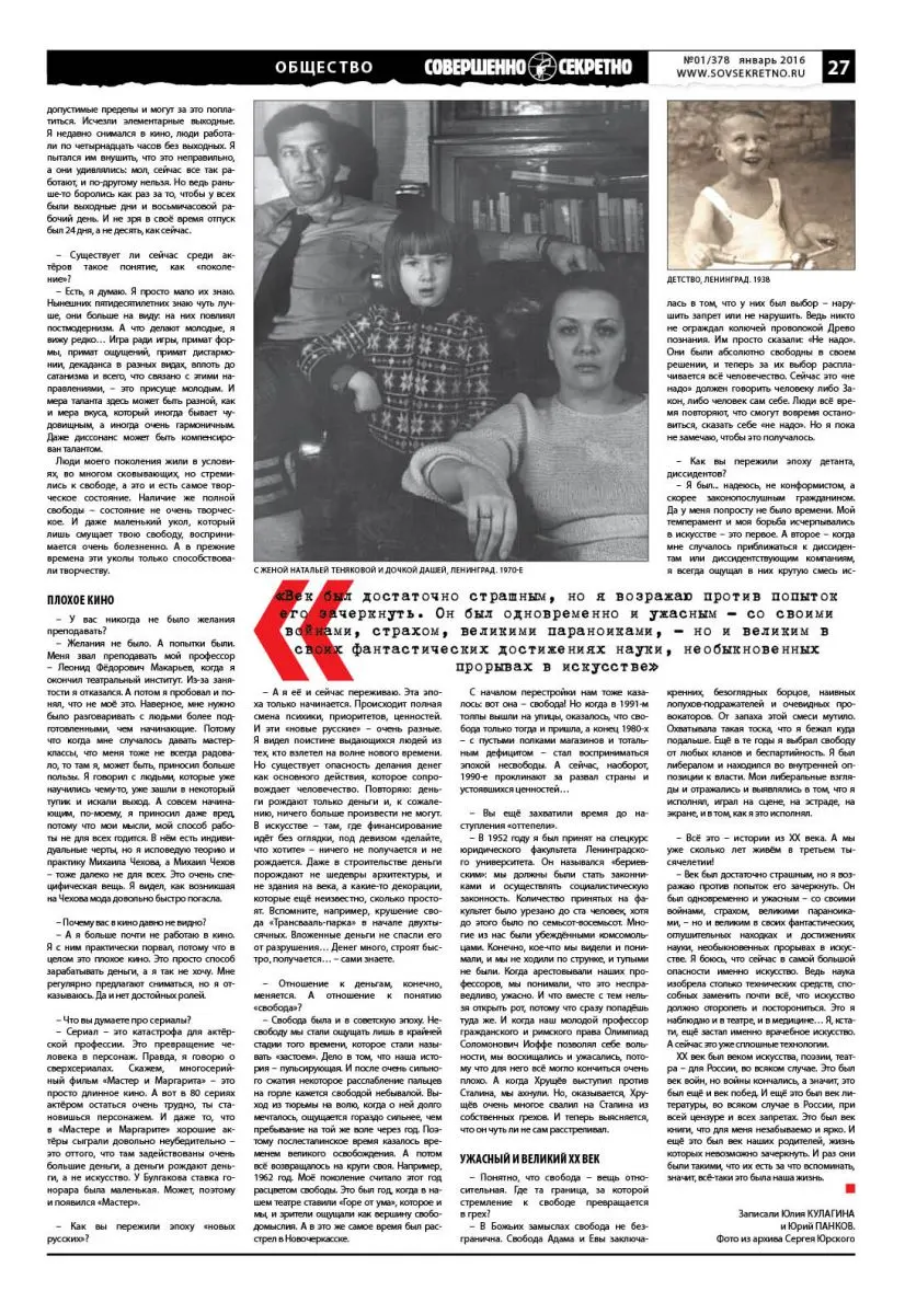 – Не могу сказать, что вся моя жизнь – работа. У меня было всё, что должно быть у нормального человека. Но, хобби, кажется, все-таки нет. И я стал гораздо меньше общаться. А в молодости общение было круглосуточным – и театральный институт, и молодая жизнь в БДТ. Да и вообще, работа, развлечения, бессонные ночи – всё смешивалось воедино. Мы постоянно были в гостях у актёров, актёры в гостях у нас… Я жил в одном доме с Копеляном, Стржельчиком… Сейчас все сложнее. Во-первых, многих друзей и коллег уже нет. Во-вторых, когда мы стареем, мы становимся более нетерпимыми к окружающим, и поэтому общение затрудняется. Да и в целом люди стали меньше общаться – из-за темпа жизни, из-за виртуальных штучек, из-за утери навыков нормального общения.