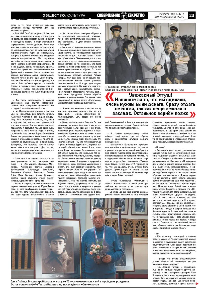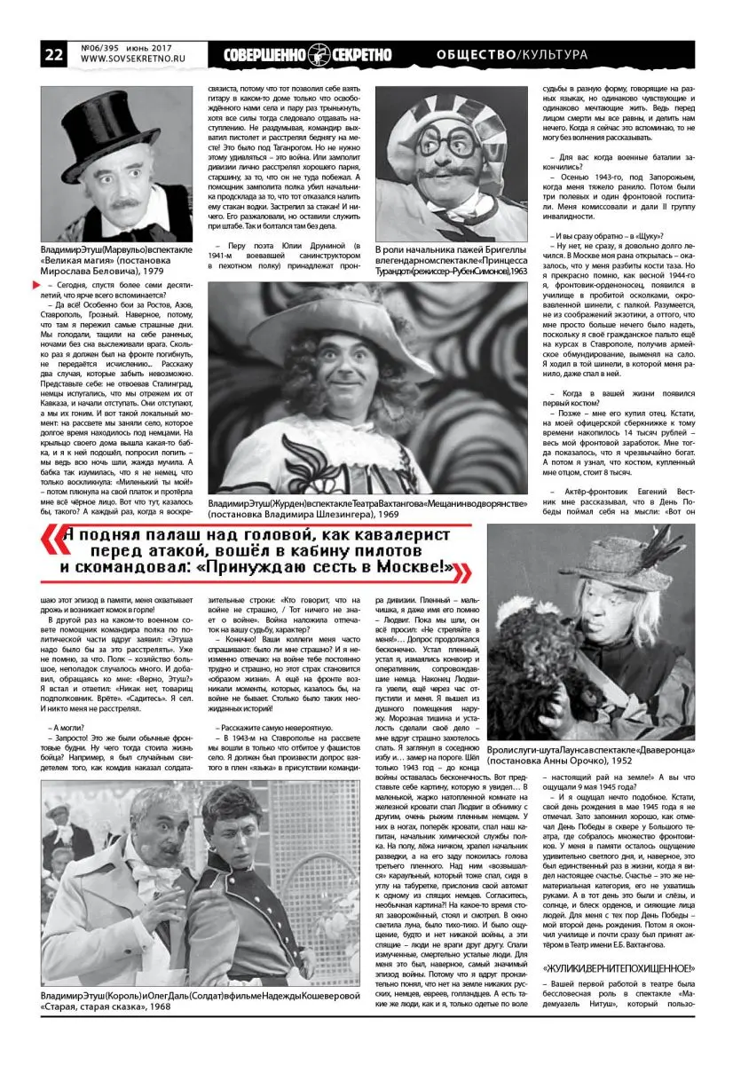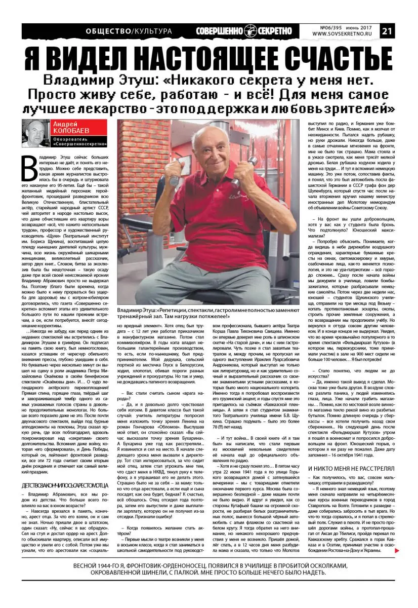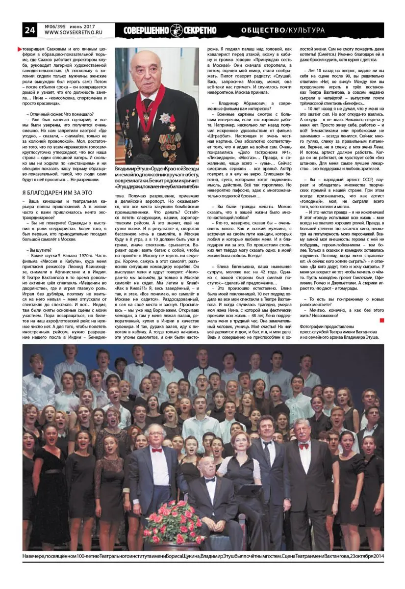 Владимир Этуш сейчас больших интервью не даёт, и понять его нетрудно. Можно себе представить, какая армия журналистов выстроилась бы в очередь и штурмовала его накануне его 95-летия. Ещё бы – такой желанный медийный персонаж: герой-фронтовик, прошедший разведчиком всю Великую Отечественную, блистательный актёр, старейший народный артист СССР, чей авторитет в народе настолько высок, что даже обчистившие его квартиру воры возвращают «всё, что нажито непосильным трудом», профессор и художественный руководитель «Щуки» (Театральный институт им. Бориса Щукина), воспитавший целую плеяду нынешних деятелей культуры, мужчина, всю жизнь окружённый шикарными женщинами, великолепный рассказчик, автор двух книг… Словом, битва за эксклюзив была бы нешуточная – такую осаду даже при всей своей неиссякаемой иронии Владимир Абрамович просто не выдержал бы. Поэтому (благо были времена, когда можно было к нему прорваться без ущерба для здоровья) мы с мэтром-юбиляром договорились, что газета «Совершенно секретно» вспомнит этапы его удивительного большого пути по нашим прежним встречам, а он, если потребуется, внесёт сегодняшние коррективы.