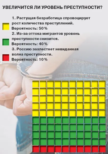 Ежедневно в новостях появляются леденящие душу истории, криминальные сводки: «москвич обезглавил жену и семимесячного ребенка», «рабочий убил руководителей своего предприятия, не выплатившего ему зарплату», «ограбили квартиру»… Исходя из опыта прожитых лет, многие россияне честно считают, что в условиях неопределенности преступность только вырастет, быстрее уровня преступности может расти только уровень коррупции. И надежд на то, что оба эти негативных фактора будут остановлены жесткой рукой государства, почти нет. В данный момент в России совершается порядка 2,6 млн преступлений в год. Аналитики МВД выложили на сайте своего ведомства неутешительный прогноз: в ближайшие 3–5 лет Россию ждут хаос, дестабилизация, криминализация, резкий рост коррупции, уличной преступности.