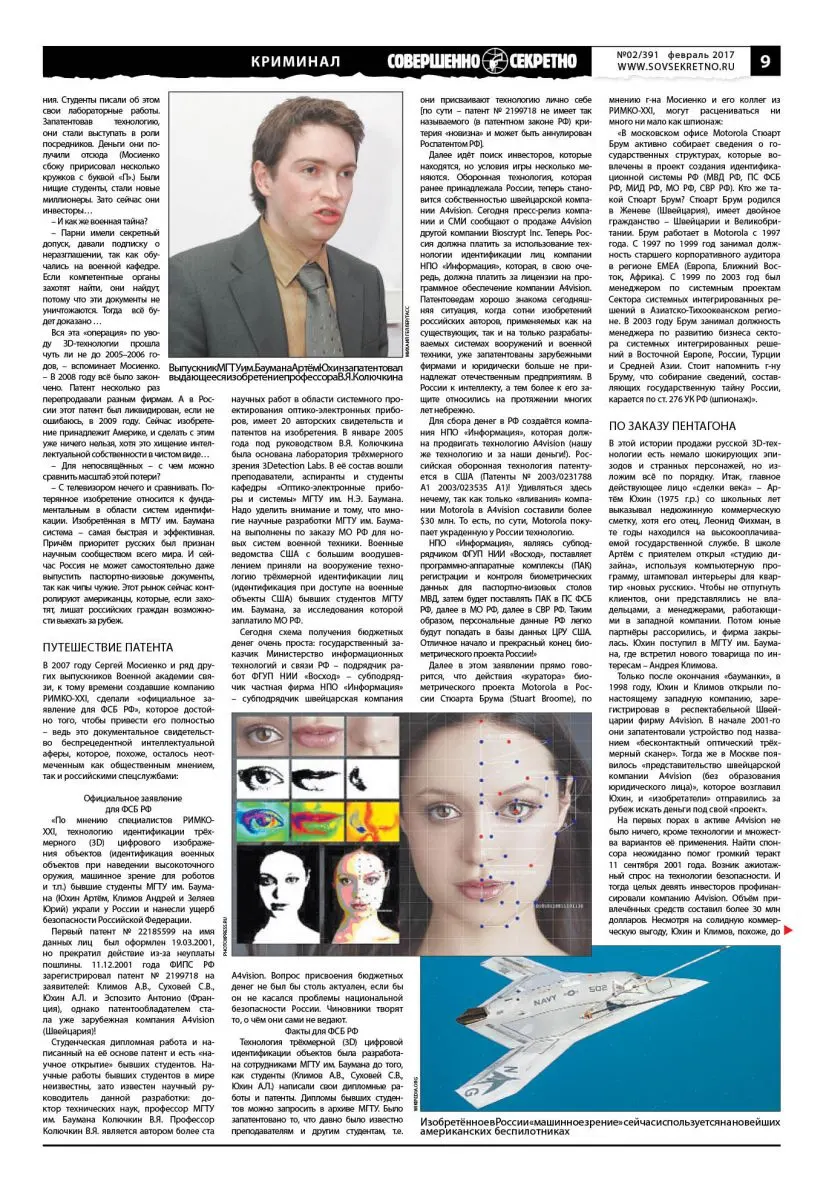 Для сбора денег в РФ создаётся компания НПО «Информация», которая должна продвигать технологию А4vision (нашу же технологию и за наши деньги!). Российская оборонная технология патентуется в США (Патенты № 2003/0231788 A1 2003/023535 A1)! Удивляться здесь нечему, так как только «вливания» компании Motorola в А4vision составили более $30 млн. То есть, по сути, Motorola покупает украденную у России технологию.