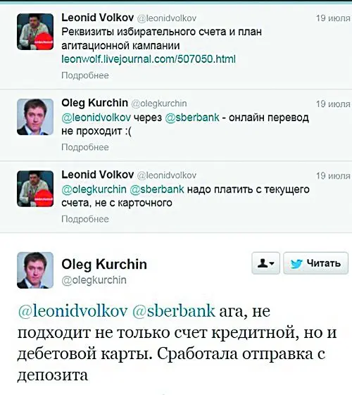 Вообще, о финансовых отношениях избирательного штаба Навального с топ-менеджерами фирмы Юхина NextStopVentures написано немало, тем более что переписку свою они, не скрываясь, подчас вели в соцсетях. Например, сохранились скриншоты переписки в «Твиттере», которая велась Леонидом Волковым, бывшим в то время начальником избирательного штаба кандидата в мэры Навального, и одним из директоров NextStopVentures Олегом Курчиным 19 июля 2013 года: