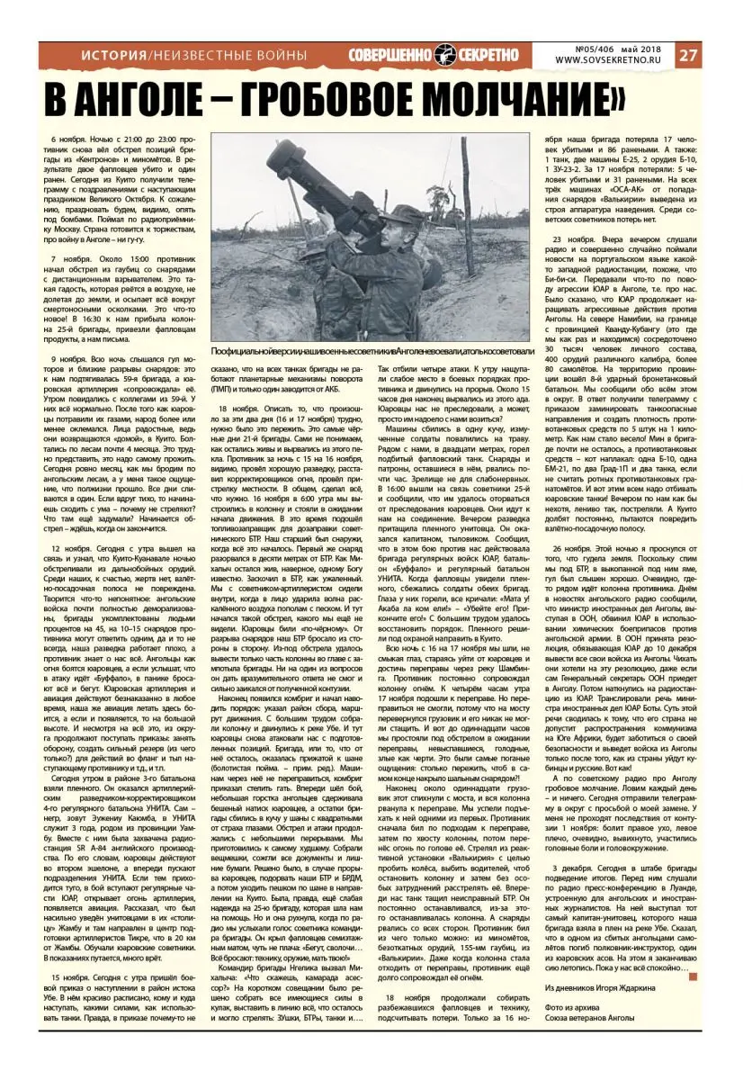 6 ноября. Ночью с 21:00 до 23:00 противник снова вёл обстрел позиций бригады из «Кентронов» и миномётов. В результате двое фапловцев убито и один ранен. Сегодня из Куито получили телеграмму с поздравлениями с наступающим праздником Великого Октября. К сожалению, праздновать будем, видимо, опять под бомбами. Поймал по радиоприёмнику Москву. Страна готовится к торжествам, про войну в Анголе – ни гу-гу.