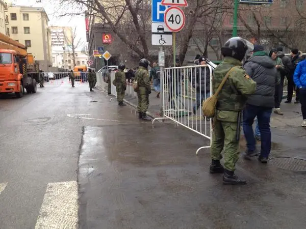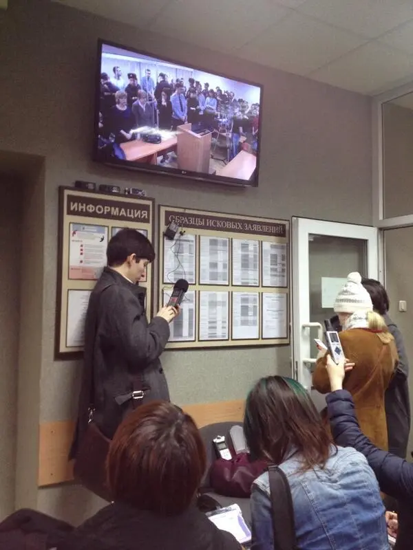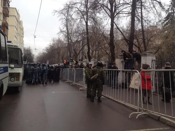 У здания суда — более десятка автозаков, много полиции. Корреспондент Ирина Чевтаева следит за тем, что происходит в зале заседания и ведет твиттер-репортаж.