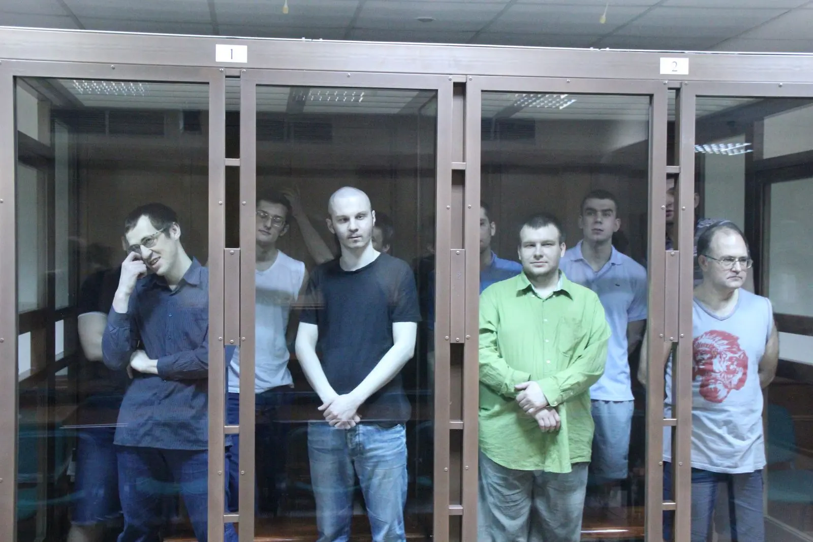 15.35 Заседание суда после перерыва продолжилось. Подсудимый Акименков просит суд изыскать возможность изменить ситуацию с плохой слышимостью в аквариуме.