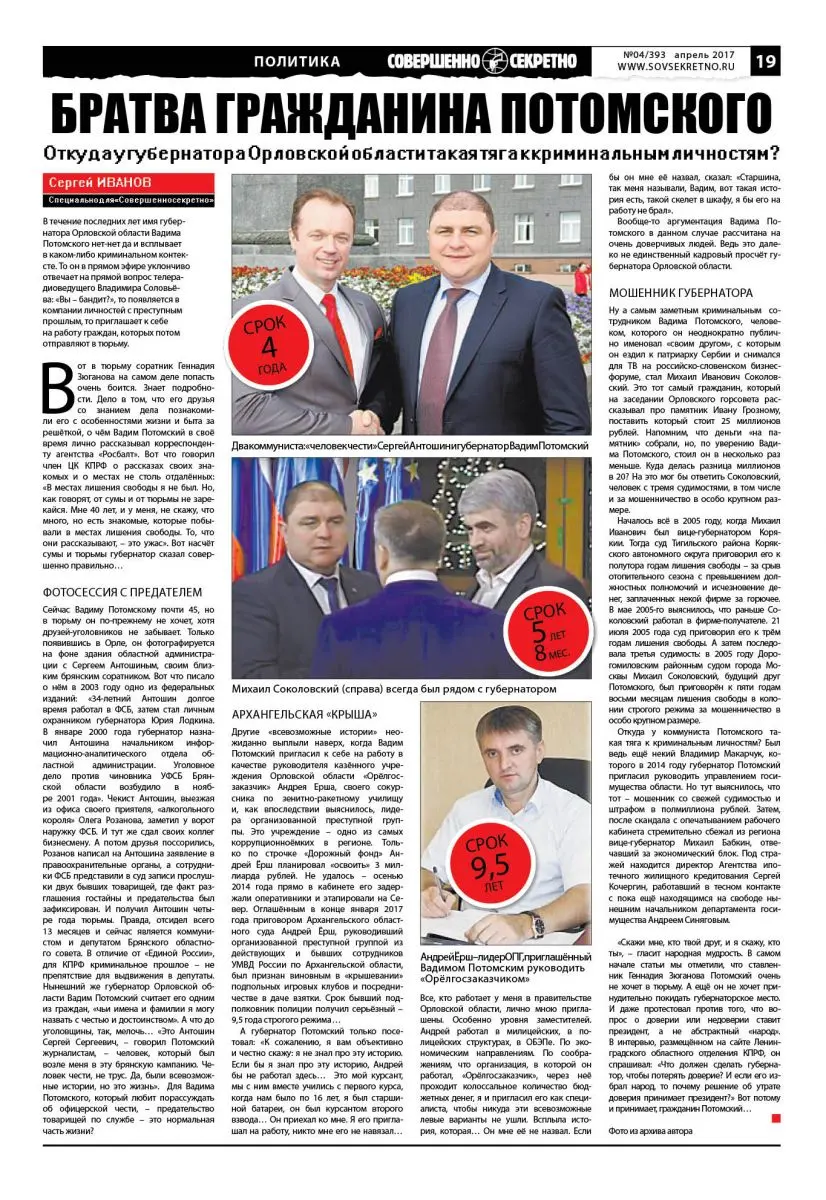 В течение последних лет имя губернатора Орловской области Вадима Потомского нет-нет да и всплывает в каком-либо криминальном контексте. То он в прямом эфире уклончиво отвечает на прямой вопрос телерадиоведущего Владимира Соловьёва: «Вы – бандит?», то появляется в компании личностей с преступным прошлым, то приглашает к себе на работу граждан, которых потом отправляют в тюрьму.