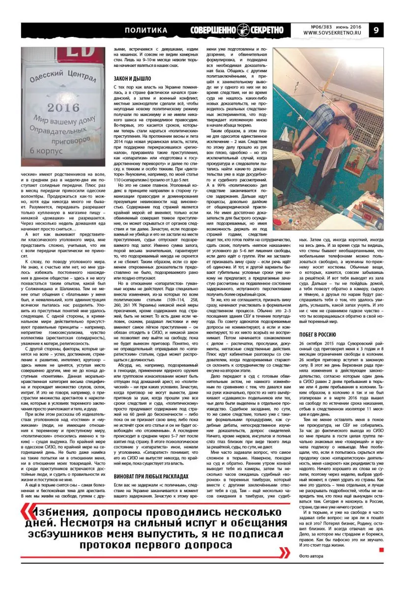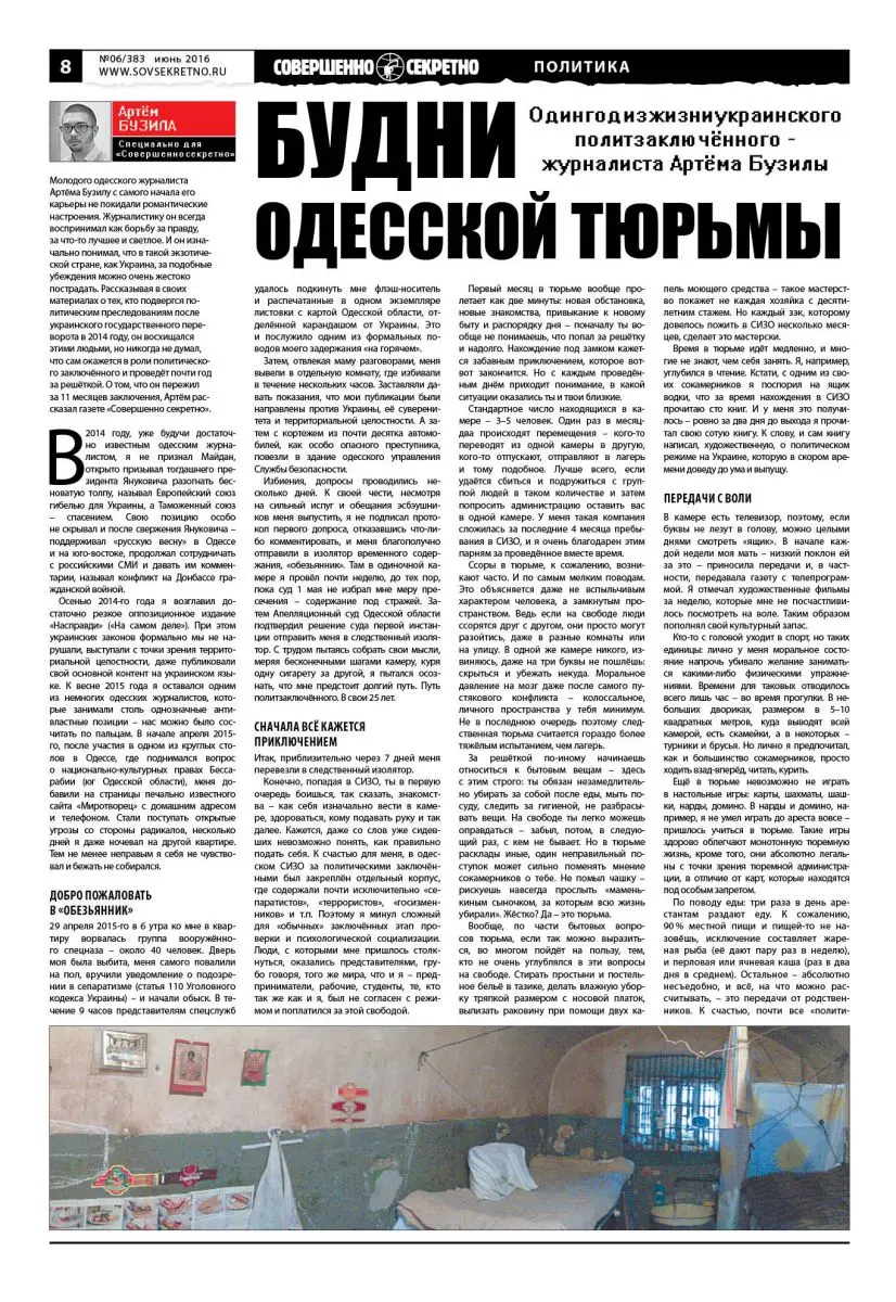 Молодого одесского журналиста Артёма Бузилу с самого начала его карьеры не покидали романтические настроения. Журналистику он всегда воспринимал как борьбу за правду, за что-то лучшее и светлое. И он изначально понимал, что в такой экзотической стране, как Украина, за подобные убеждения можно очень жестоко пострадать. Рассказывая в своих материалах о тех, кто подвергся политическим преследованиям после украинского государственного переворота в 2014 году, он восхищался этими людьми, но никогда не думал, что сам окажется в роли политического заключённого и проведёт почти год за решёткой. О том, что он пережил за 11 месяцев заключения, Артём рассказал газете «Совершенно секретно».