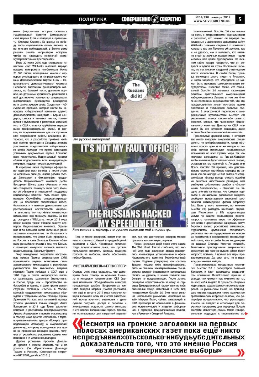 Позднее перед хакерами, утверждают американские силовики, поставили более масштабную задачу – попытаться дискредитировать всю политическую систему США. «Они хотели внести раскол в ряды ключевых американских союзников, убедив их в том, что (другие страны) больше не могут рассчитывать на Соединённые Штаты как надёжного глобального лидера», – заявил в эфире NBC высокопоставленный представитель спецслужб. В тот же день эту информацию поддержали и собственные источники телеканала CBS уже со ссылкой на данные ЦРУ. Журналисты безапелляционно сообщили, что ещё одной целью организованных Кремлём хакерских атак было «оказание помощи в избрании Президентом США Дональда Трампа», а для реализации этого плана российские спецслужбы передали все собранные документы скандально известному сайту WikiLeaks