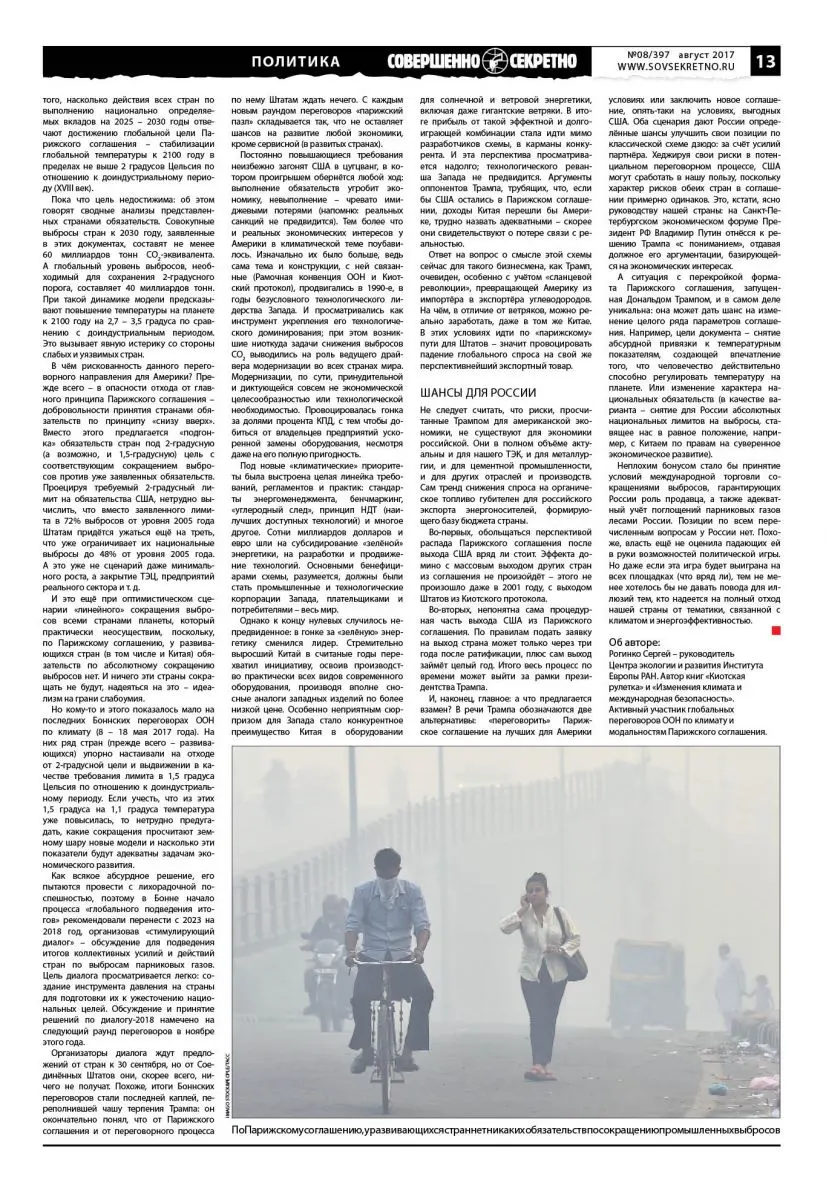 А ситуация с перекройкой формата Парижского соглашения, запущенная Дональдом Трампом, и в самом деле уникальна: она может дать шанс на изменение целого ряда параметров соглашения. Например, цели документа – снятие абсурдной привязки к температурным показателям, создающей впечатление того, что человечество действительно способно регулировать температуру на планете. Или изменение характера национальных обязательств (в качестве варианта – снятие для России абсолютных национальных лимитов на выбросы, ставящее нас в равное положение, например, с Китаем по правам на суверенное экономическое развитие).
