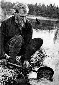 Рабочий промывает в старательском ковше собранный золотой песок |