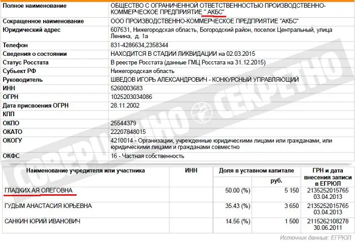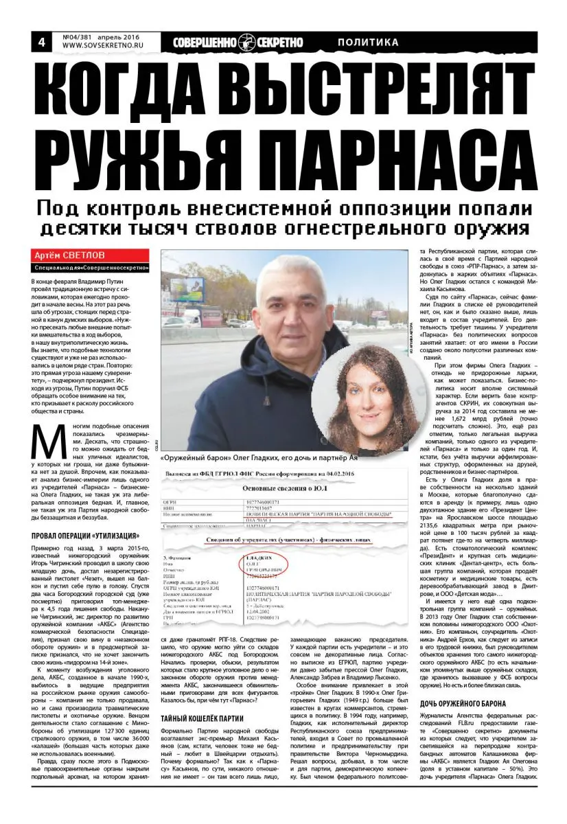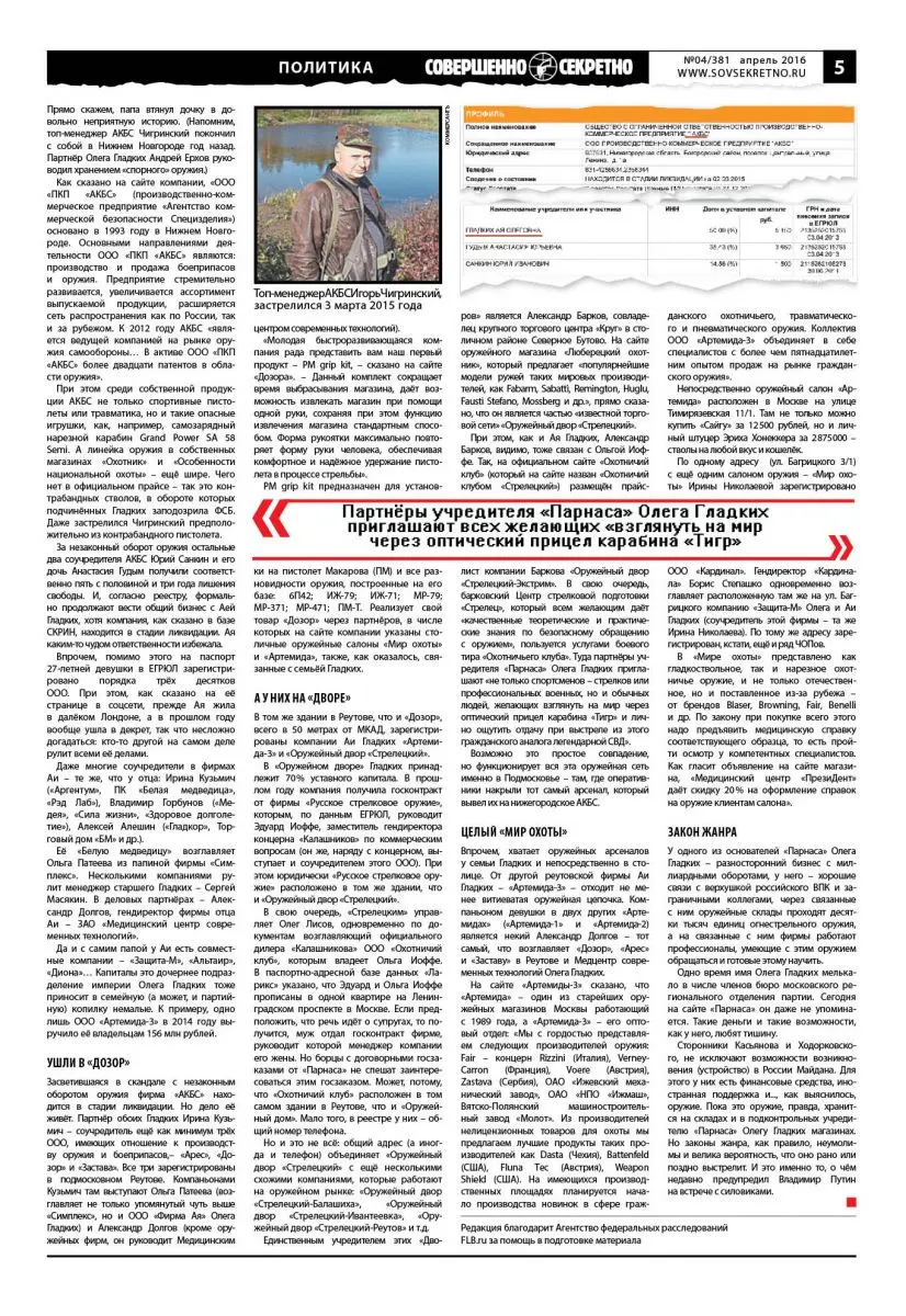 Журналисты Агентства федеральных расследований FLB.ru предоставили газете «Совершенно секретно» документы из которых следует, что учредителем засветившейся на перепродаже контрабандных автоматов Калашникова фирмы «АКБС» является Гладких Ая Олеговна (доля в уставном капитале – 50 %). Это дочь учредителя «Парнаса» Олега Гладких. Прямо скажем, папа втянул дочку в довольно неприятную историю. (Напомним, топ-менеджер АКБС Чигринский покончил с собой в Нижнем Новгороде год назад. Партнёр Олега Гладких Андрей Ерхов руководил хранением «спорного» оружия.)