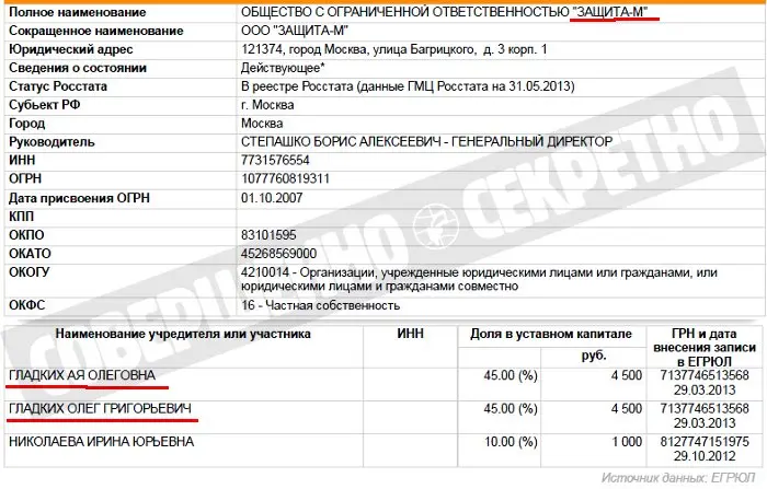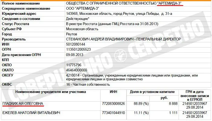 Да и с самим папой у Аи есть совместные компании – «Защита-М», «Альтаир», «Диона»… Капиталы это дочернее подразделение империи Олега Гладких тоже приносит в семейную (а может, и партийную) копилку немалые. К примеру, одно лишь ООО «Артемида-3» в 2014 году выручило её владельцам 156 млн рублей.