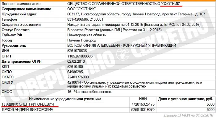 И имеется у него ещё одна подконтрольная группа компаний – оружейных. В 2013 году Олег Гладких стал собственником половины нижегородского ООО «Охотник». Его компаньон, соучредитель «Охотника» Андрей Ерхов, как следует из записи в его трудовой книжке, был руководителем объектов хранения того самого нижегородского оружейного АКБС (то есть начальником упомянутых выше оружейных складов, где хранилось вызвавшее у ФСБ вопросы оружие). Но есть и более близкая связь.