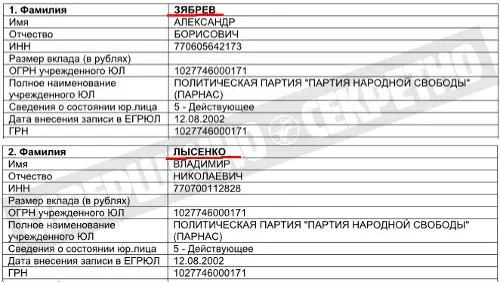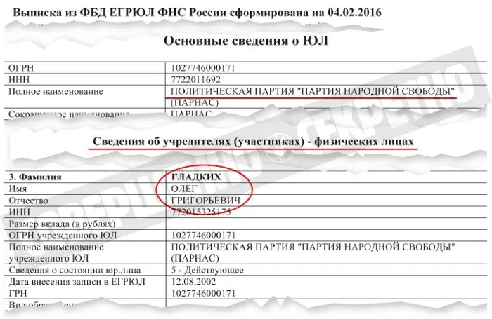 Формально Партию народной свободы возглавляет экс-премьер Михаил Касьянов (сам, кстати, человек тоже не бедный – любит в Швейцарии отдыхать). Почему формально? Так как к «Парнасу» Касьянов, по сути, никакого отношения не имеет – он там всего лишь лицо, замещающее вакансию председателя. У каждой партии есть учредители – и это совсем не декоративные лица. Согласно выписке из ЕГРЮЛ, партию учредили давно забытые прессой Олег Гладких, Александр Зябрев и Владимир Лысенко.