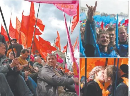 «Оранжевых» пока на Европейском Майдане немного: в основном, это молодежь. Причем студенческая. Причем киевская. В организованном порядке их снимают с занятий. Платят те же 60-100 гривен в день. Плюс горячее питание, плюс экипировка: тоже знамена в большом количестве, только оранжевые (цвет глаз радует не в пример больше холодных розового и голубого, честно скажу); тоже нейлоновые попоны на случай дождя, оранжевые капроновые ленты – в моем детстве такие вплетали в косы первоклассницам, и т.д. Обходятся «оранжисты» казне немного дешевле, чем поклонники Януковича, – все местные, не надо везти на автобусах за тридевять земель. (Хотя, надо полагать, исчерпается киевский студенческий ресурс – повезут теми же автобусами со Львiвщины да с Сумщины). Но тоже недешевое удовольствие. Если оба митинга так и простоят до конца мая, на который назначены внеочередные выборы, от восьми процентов украинского экономического роста, надо думать, мало что останется. Но об этом сейчас никто не думает.