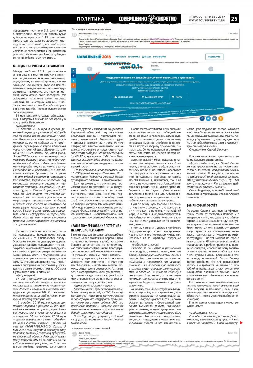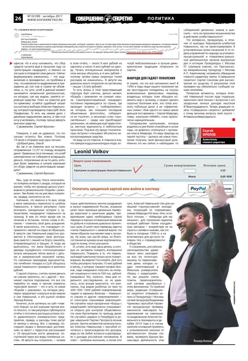 К сожалению, российское законодательство удивительно вяло реагирует на всю эту гигантскую машину по перекачиванию денег, которую создал патентованный в Йельском университете «борец с коррупцией». Но мы решили слегка помочь правоохранительной системе разобраться с этим феноменом. По крайней мере, редакция «Совершенно секретно» отправила запрос в Прокуратуру г. Москвы на имя прокурора Владимира Чурикова с просьбой «провести прокурорскую проверку законности невозврата пожертвования на кампанию по выдвижению Алексея Навального в президенты в декабре 2016 года и в случае наличия оснований привлечь к установленной законом ответственности». Иными словами, проверить бурную финансовую деятельность этих собирателей денежных знаков и выяснить – есть ли признаки мошенничества в действиях штаба Навального?