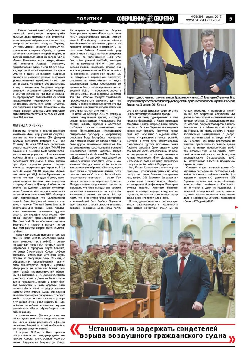 1 апреля 2015-го в Киев приехал спецпосланник по международным вопросам Совета транспортной безопасности Нидерландов Андриан де Сегед. На встрече в Министерстве обороны было решено версию «Бука» в расследовании авиакатастрофы сделать единственной. Российскому концерну «Алмаз-Антей» ничего не оставалось другого, как провести собственную экспертизу. В начале июня 2016-го «Алмаз-Антей» представил свои выводы, которые сводились к тому, что малайзийский «Боинг-777» был «сбит ракетой 9М38М1, выпущенной из комплекса «Бук-М1». Это устаревшая модель комплекса, которая снята с вооружения в частях РФ, но остаётся на вооружении украинской армии. (Мы не собираемся опровергать экспертизу специалистов «Алмаз-Антея» – задача расследования газеты «Совершенно секретно» и Агентства федеральных расследований FLB.ru – продемонстрировать, что есть целый пласт секретных документов СБУ, которые требуют тщательного профессионального изучения, для того чтобы наконец разобраться в том, кто был истинным виновником гибели малайзийского «Боинга-777», рейс MH17.
