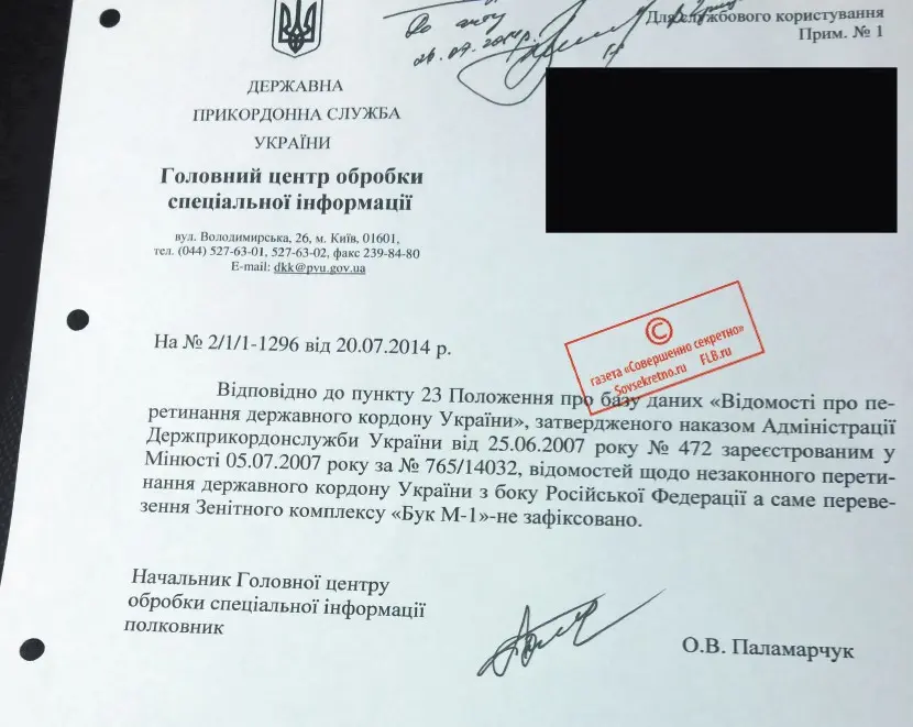 Этот документ Государственной пограничной службы Украины под грифом ДСП нас, честно говоря, немного озадачил. Особенно если его рассматривать в контексте первых четырёх опубликованных нами секретных приказов СБУ (с ними вы можете познакомиться ниже). Смотрите, что получается. Начальник Главного центра обработки специальной информации погранслужбы Украины полковник А.В. Паламарчук пишет, что «сведений о перемещении» ЗРК «Бук М-1» не зафиксировано». Запрос датирован 20 июля 2014 года – в этот же день, как мы уже знаем, первый заместитель начальника СБУ В.С. Грицак утверждает «План основных организационных, контрразведывательных и оперативно-розыскных мероприятий ДКР СБУ от 20.07. 2014 г. № 1/1-837», одним из пунктов которого значится спецоперация «по уничтожению фактов, свидетельствующих о боевых вылетах авиации ВСУ в районе авиакатастрофы 17.07.2014 года». Мы полагаем, что через три дня после трагедии и спецслужбы, и высшее политическое руководство Украины уже владели полной информацией об истинных причинах и виновниках уничтожения малайзийского «Боинга-777». Поэтому зенитно-ракетный комплекс «Бук» как орудие убийства в их секретных документах на удивление нигде не фигурирует. Они озабочены уничтожением совсем других улик. Зачем же Госпогранслужбе Украины понадобилось информировать СБУ о том, что российского «Бука М-1» на территории Украины не было? Естественно, мы попросили человека, который предоставил нам эти документы, объяснить происхождение этого письма.