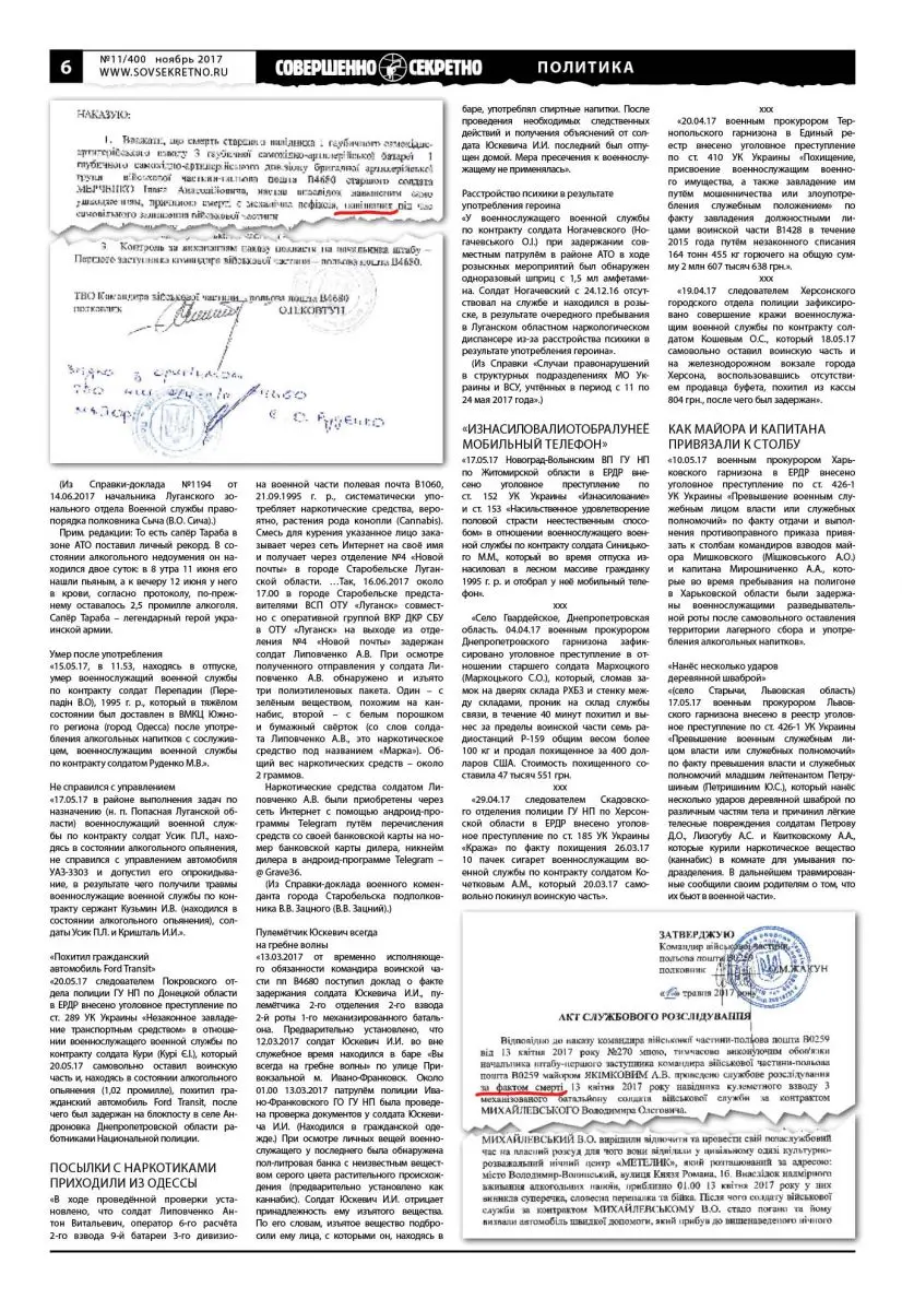 Повседневная жизнь Вооружённых сил Украины: самоубийства, алкоголизм, болезни, криминал, дезертирство. Газета «Совершенно секретно» публикует закрытые служебные документы 13-го армейского корпуса сухопутных войск ВСУ