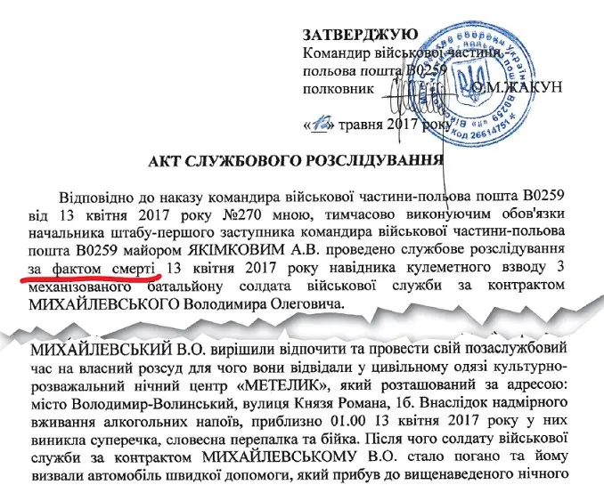 «15.05.17, в 11.53, находясь в отпуске, умер военнослужащий военной службы по контракту солдат Перепадин (Перепадін В.О), 1995 г. р., который в тяжёлом состоянии был доставлен в ВМКЦ Южного региона (город Одесса) после употребления алкогольных напитков с сослуживцем, военнослужащим военной службы по контракту солдатом Руденко М.В.».