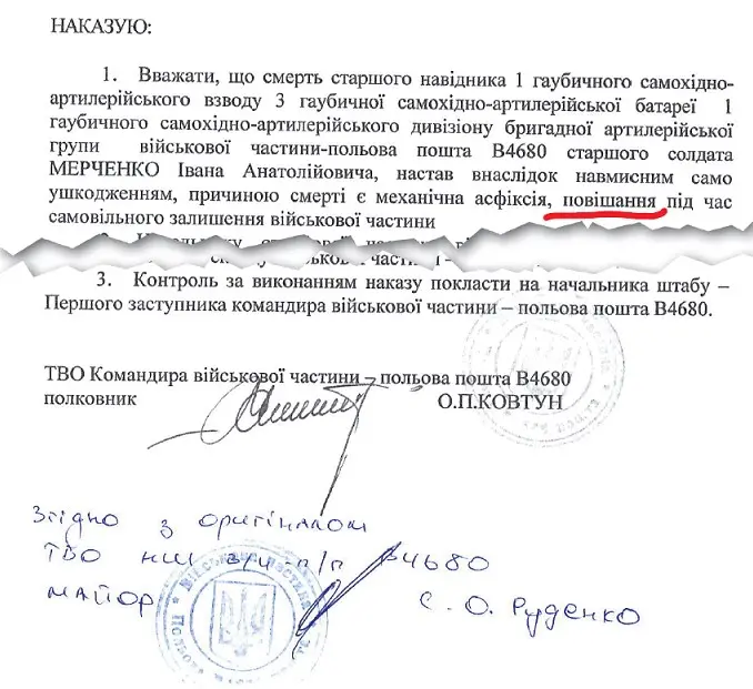 «10.05.17 военным прокурором Харьковского гарнизона в ЕРДР внесено уголовное преступление по ст. 426-1 УК Украины «Превышение военным служебным лицом власти или служебных полномочий» по факту отдачи и выполнения противоправного приказа привязать к столбам командиров взводов майора Мишковского (Мішковського А.О.) и капитана Мирошниченко А.А., которые во время пребывания на полигоне в Харьковской области были задержаны военнослужащими разведывательной роты после самовольного оставления территории лагерного сбора и употребления алкогольных напитков».