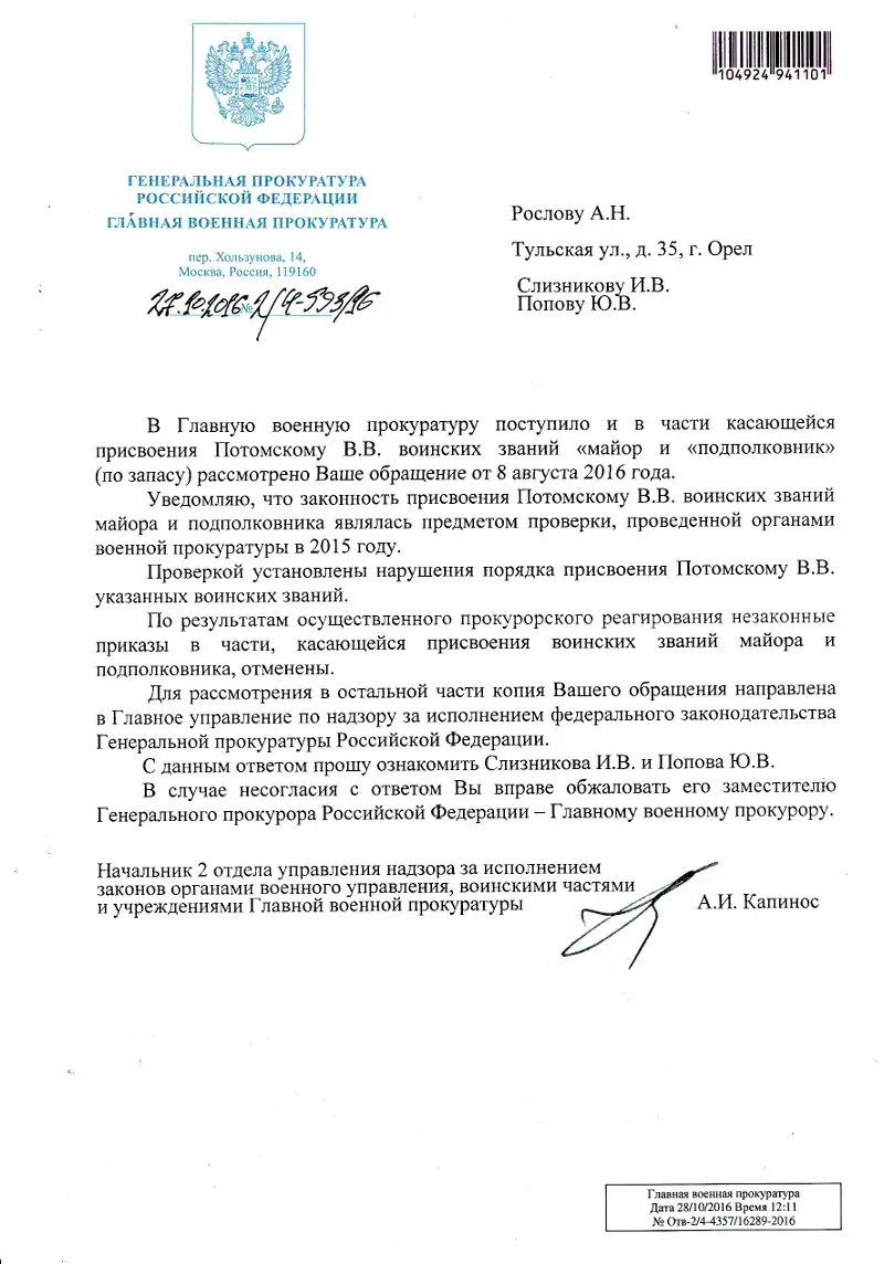 А насчёт присвоения Вадиму Владимировичу Потомскому звания подполковника, возможно, что-то может рассказать бывший министр обороны Российской Федерации Анатолий Сердюков, который по должности подписывал приказ от 30 июня 2009 года. Ждём новых документов, всё-таки если даже член ЦК КПРФ Владимир Кашин посчитал ситуацию «коррупционной», то не грех бы и прояснить её. От того, что со времени незаконного получения воинских званий Потомским прошло семь лет, возможная коррупционная составляющая не испаряется. Было ли достаточно сделать военкома помощником, или существовала какая-то другая «компенсация» за «звёздочки», должны выяснять следователи. Ведь сегодня у нас нет неприкасаемых, правда?
