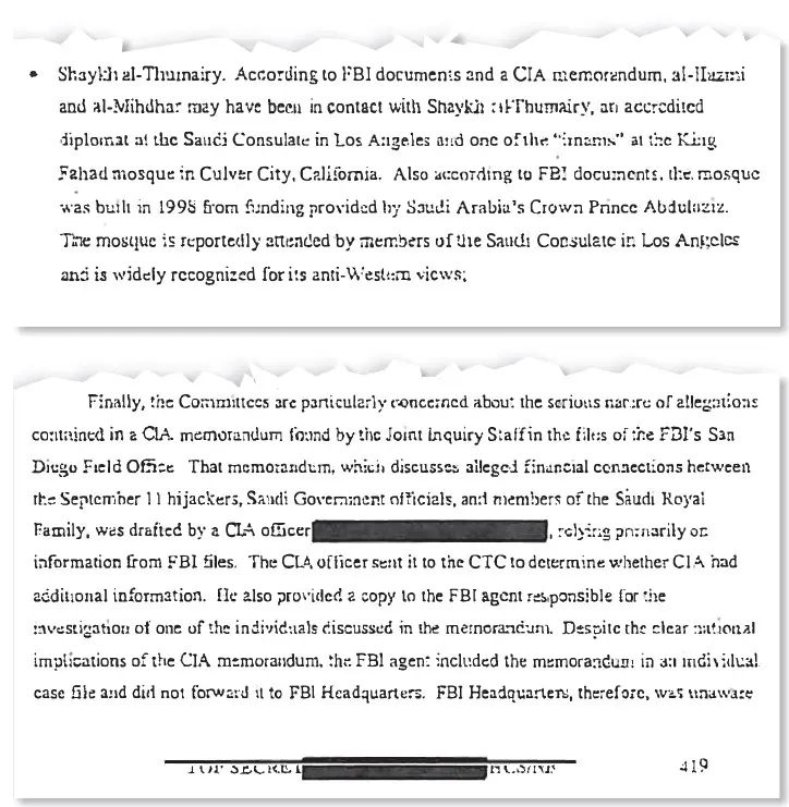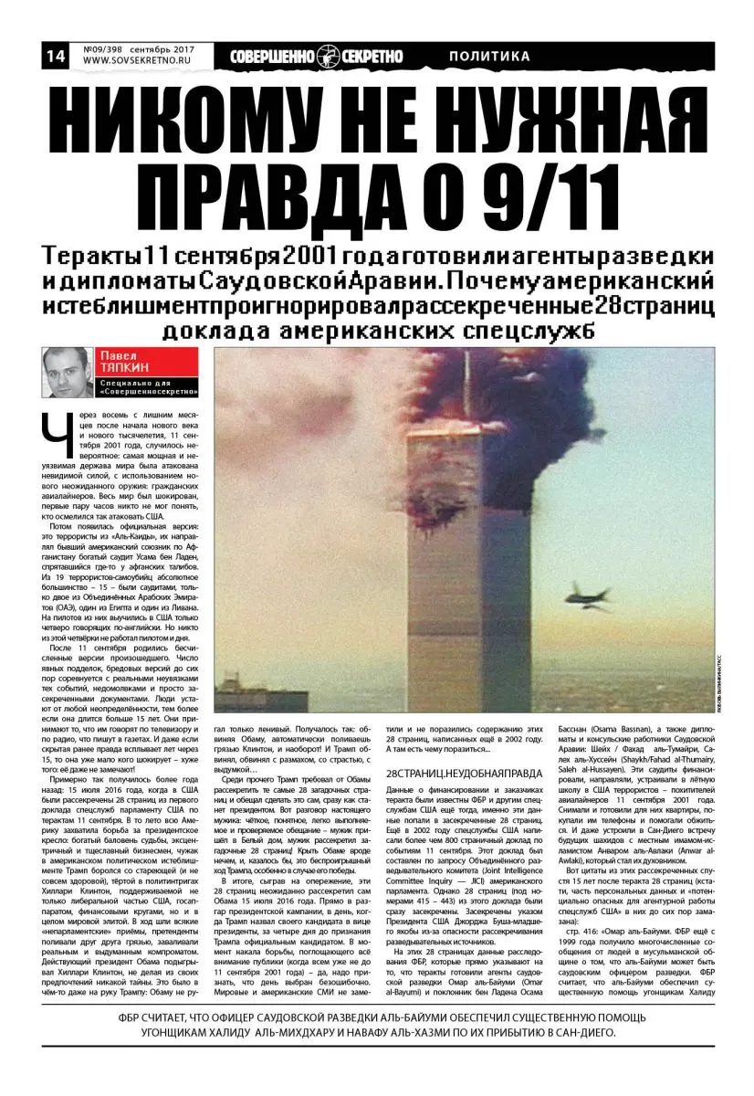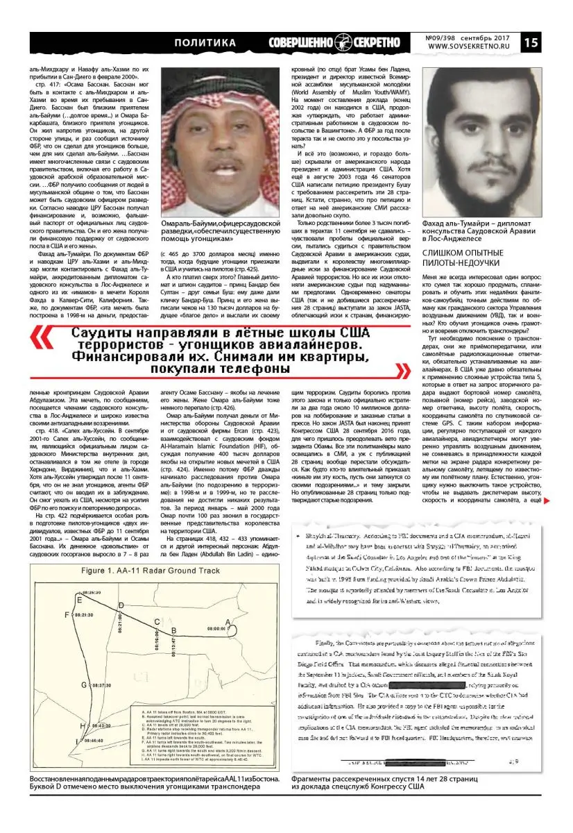 На этих 28 страницах данные расследования ФБР, которые прямо указывают на то, что теракты готовили агенты саудовской разведки Омар аль-Байуми (Omaral-Bayumi) и поклонник бен Ладена Осама Басснан (OsamaBassnan), а также дипломаты и консульские работники Саудовской Аравии: Шейх / Фахад аль-Тумайри, Салех аль-Хуссейн (Shaykh/Fahadal-Thumairy, Salehal-Hussayen). Эти саудиты финансировали, направляли, устраивали в лётную школу в США террористов – похитителей авиалайнеров 11 сентября 2001 года. Снимали и готовили для них квартиры, покупали им телефоны и помогали обжиться. И даже устроили в Сан-Диего встречу будущих шахидов с местным имамом-исламистом Анваром аль-Авлаки (Anwaral-Awlaki), который стал их духовником