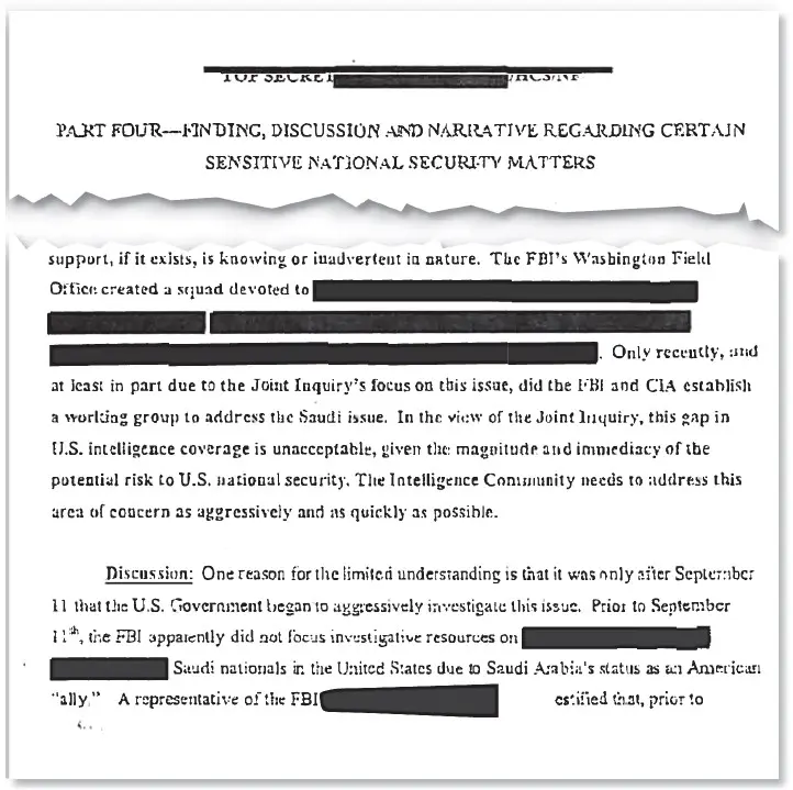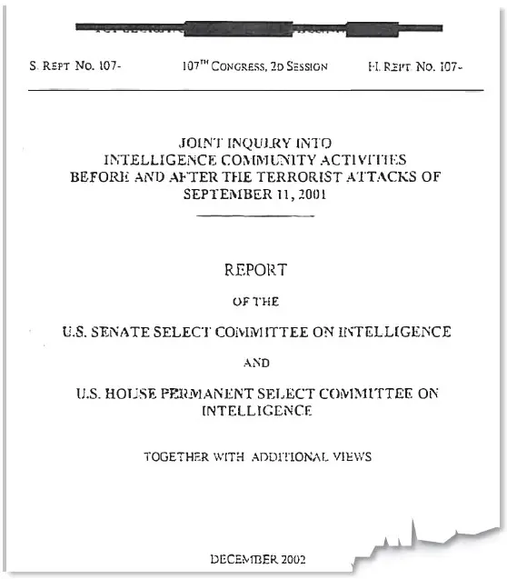 Данные о финансировании и заказчиках теракта были известны ФБР и другим спецслужбам США ещё тогда, именно эти данные попали в засекреченные 28 страниц. Ещё в 2002 году спецслужбы США написали более чем 800 страничный доклад по событиям 11 сентября. Этот доклад был составлен по запросу Объединённого разведывательного комитета (JointIntelligenceCommitteeInquiry — JICI) американского парламента. Однако 28 страниц (под номерами 415 – 443) из этого доклада были сразу засекречены. Засекречены указом Президента США Джорджа Буша-младшего якобы из-за опасности рассекречивания разведывательных источников.