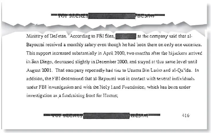 Вот цитаты из этих рассекреченных спустя 15 лет после теракта 28 страниц (кстати, часть персональных данных и «потенциально опасных для агентурной работы спецслужб США» в них до сих пор замазана):