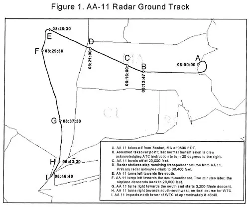 В 08:21 был выключен транспондер. Самолёт в этот момент был внутри FIRZBW, на границе штатов Массачусетс и Нью-Йорк. Бостонский борт в тот момент вели только вторичные радары, которые посылают сигналы транспондерам вокруг и получают от них ответы с данными о координатах, высоте и скорости самолётов. Перед 2001 годом в США ради экономии иногда списывали ещё годные гражданские первичные радары, оставляя только вторичные, и даже строили новые радарные посты без первичных радаров. Эта пагубная практика в данном случае привела к тому, что, когда транспондер выключили, самолёт просто исчез со всех вторичных радаров, а первичных гражданских радаров вокруг не было. При расследовании угона траекторию и высоту AAL11 восстановили по записям первичного военного радара дальнего действия.