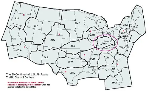 Карта деления США на Районы полётной информации (РПИ или FIR). В каждом из таких регионов полёты контролирует отдельный диспетчерский центр
