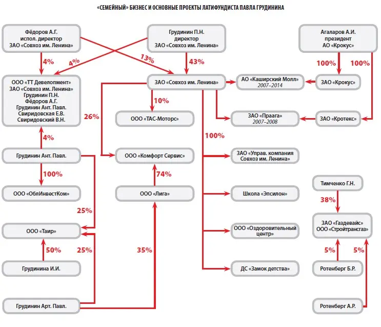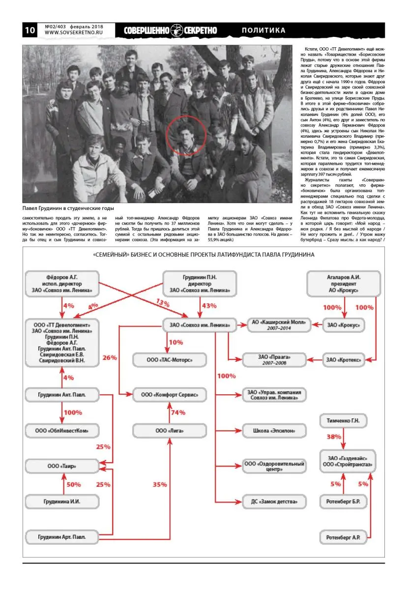 Кстати, ООО «ТТ Девелопмент» ещё можно назвать «Товариществом «Борисовские Пруды», потому что в основе этой фирмы лежат старые дружеские отношения Павла Грудинина, Александра Фёдорова и Николая Свиридовского, которые знают друг друга ещё с начала 1990-х годов. Фёдоров и Свиридовский на заре своей совхозной бизнес-деятельности жили в одном доме в Братеево, на улице Борисовские Пруды. В итоге в этой фирме-«боковичке» собрались друзья и их родственники: Павел Николаевич Грудинин (4% долей ООО), его сын Антон (4%), его друг и заместитель по совхозу Александр Германович Фёдоров (4%), здесь же устроены сын Николая Николаевича Свиридовского Владимир (примерно 0,7%) и его жена Свиридовская Екатерина Владимировна (примерно 3,3%), которая стала гендиректором «Девелопмента». Кстати, это та самая Свиридовская, которая параллельно трудится топ-менеджером в совхозе и получает ежемесячную зарплату 397 тысяч рублей.