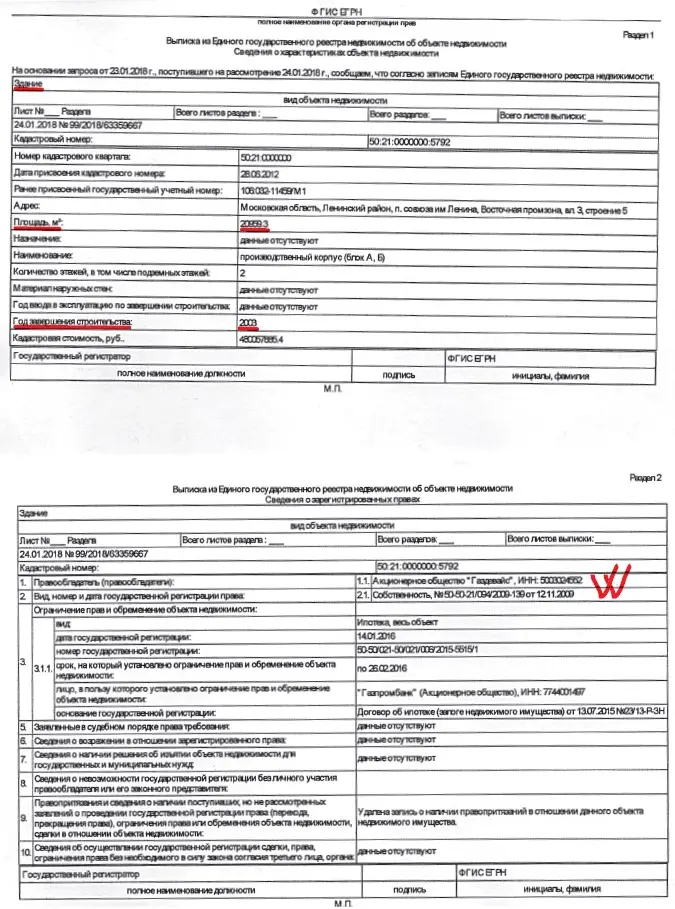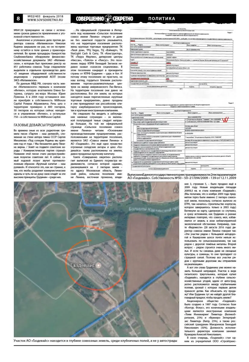 Газета «Совершенно секретно» располагает выпиской из Единого госреестра недвижимости, согласно которой «здание», раскинувшееся на 2 гектарах земли –по адресу Московская область, Ленинский район, сельское поселение имени Ленина, восточная промзона, владение 3, строение 5, – было продано ещё в 2009 году. Новым владельцем площади 20959,3 кв. м стала компания «Газдевайс». (Мы полагаем, что в ноябре 2009 года предметом торга были именно 2 гектара совхозной земли, поскольку, согласно выписке из ЕГРН, там началось строительство корпусов, которое завершилось только в 2003 году.) Взглянули на карту, сделанную со спутника, и сразу вспомнили, как Грудинин в разных интервью повторял, что совхоз, мол, избавляется от земель в зоне неблагоприятной экологической обстановки. Например, газете «Ведомости» (28 августа 2016 года) директор совхоза имени Ленина говорил так: «Эти участки рядом с Кольцевой автодорогой и Каширским шоссе почти нельзя использовать по сельхозназначению, так как рядом с дорогой тяжёлые металлы. Второй вопрос – рядом строится очень много жилья. И если ты сажаешь даже не овощные культуры, а саженцы, то они пропадают со страшной силой. Поэтому все участки рядом с крупными дорогами мы отправляем на реализацию».