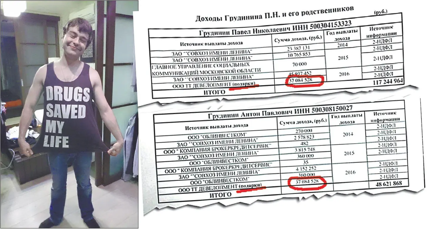 Доходы Павла Грудинина и его сына Антона. (На фото – Антон Грудинин, надпись на майке – «Наркотики спасли мою жизнь».)
