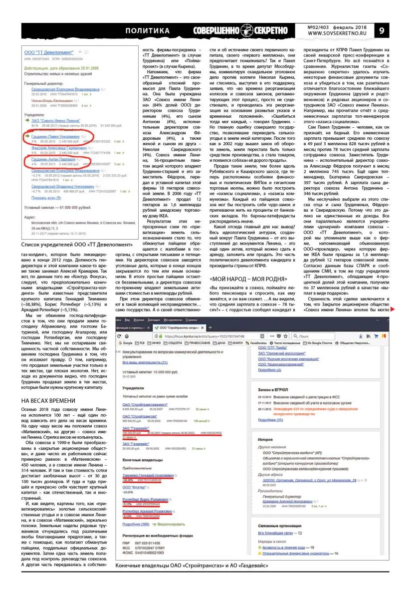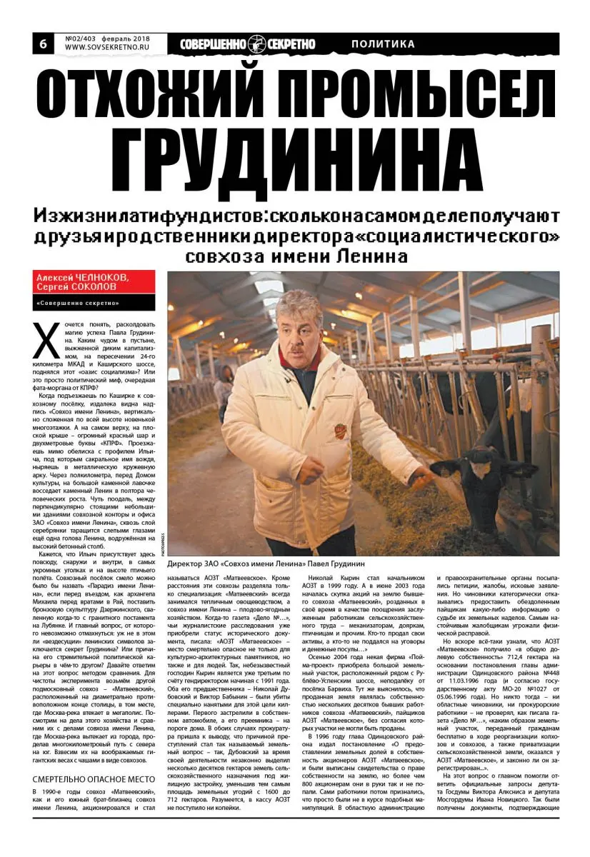 Журналисты газеты «Совершенно секретно» полагают, что фирма-«боковичок» была организована топ-менеджерами специально под сделки с распродажей 18 гектаров совхозной земли в обход ЗАО «Совхоз имени Ленина». Как тут не вспомнить гениальную сказку Леонида Филатова про Федота-молодца, в которой царь говорит: «Мой народ – моя родня. / Я без мыслей об народе / Не могу прожить и дня!.. / Утром мажу бутерброд – Сразу мысль: а как народ? / И икра не лезет в горло, / И компот не льётся в рот! / Ночью стану у окна – И стою всю ночь без сна. / Всё волнуюсь об Расее: / Как там бедная она?..»