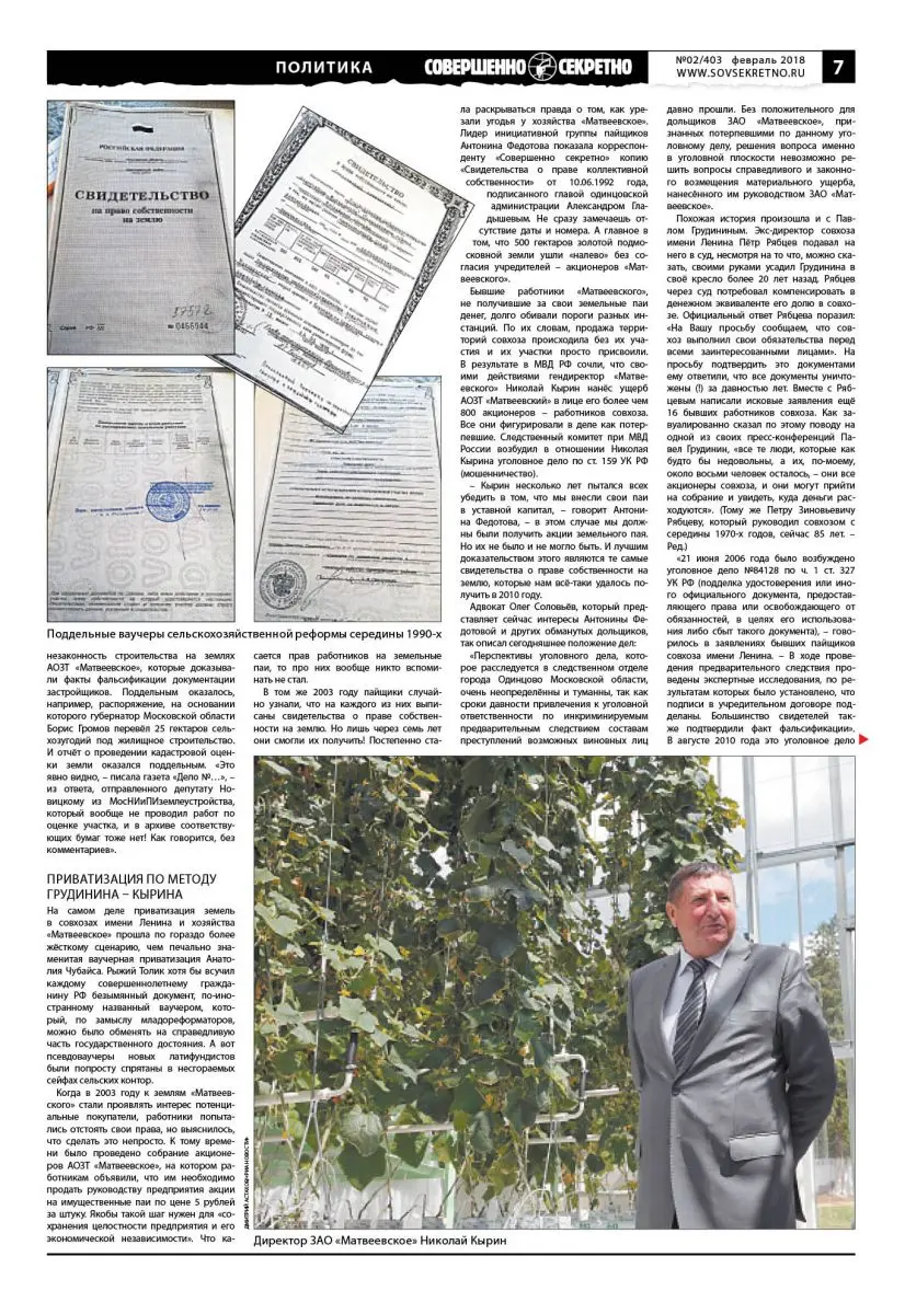 В том же 2003 году пайщики случайно узнали, что на каждого из них выписаны свидетельства о праве собственности на землю. Но лишь через семь лет они смогли их получить! Постепенно стала раскрываться правда о том, как урезали угодья у хозяйства «Матвеевское». Лидер инициативной группы пайщиков Антонина Федотова показала корреспонденту «Совершенно секретно» копию «Свидетельства о праве коллективной собственности» от 10.06.1992 года, подписанного главой одинцовской администрации Александром Гладышевым. Не сразу замечаешь отсутствие даты и номера. А главное в том, что 500 гектаров золотой подмосковной земли ушли «налево» без согласия учредителей – акционеров «Матвеевского».
