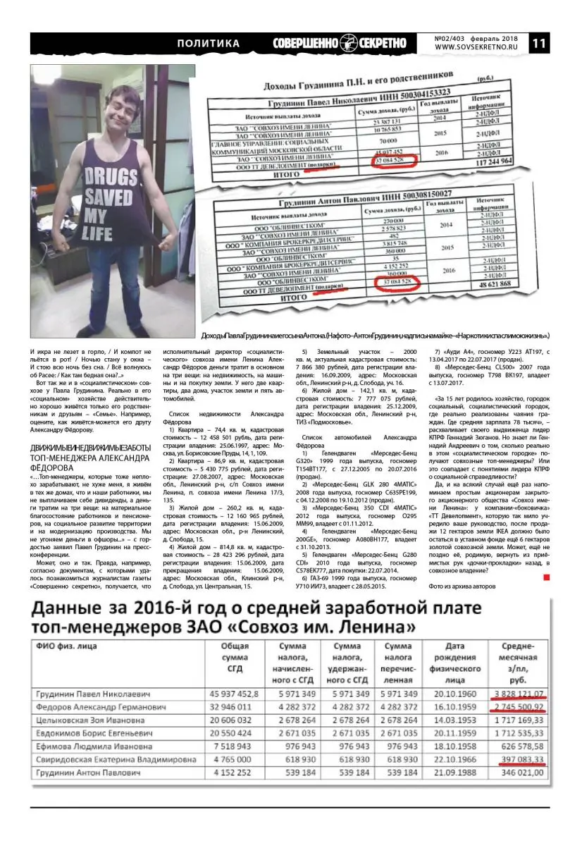 «Вы приезжайте в совхоз, поймайте любого пенсионера и спросите, как ему живётся, и он вам скажет. …А вы видели, что средняя зарплата в совхозе – 78 тысяч?» – с гордостью сообщил кандидат в президенты от КПРФ Павел Грудинин на своей январской пресс-конференции в Санкт-Петербурге. Но всё познаётся в сравнении. Журналистам газеты «Совершенно секретно» удалось изучить некоторые финансовые документы совхоза и убедиться в том, как разительно отличается благосостояние ближайшего окружения Грудинина (друзей и родственников) и рядовых акционеров и сотрудников ЗАО «Совхоз имени Ленина». Например, мы прочитали отчёт о среднемесячных зарплатах топ-менеджеров этого «оазиса социализма».
